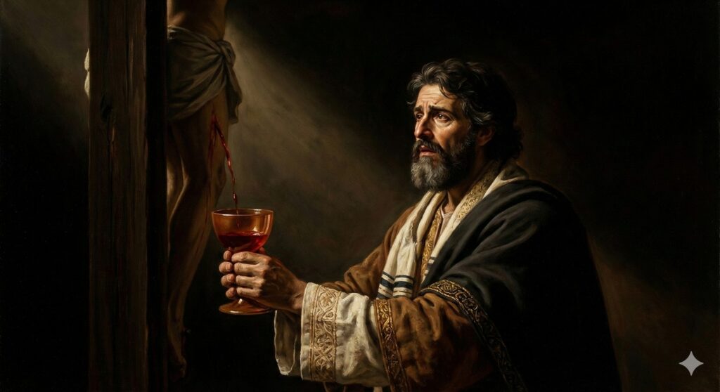 Tras la crucifixión, la tradición identifica este mismo cáliz como la copa que usó José de Arimatea para recoger la sangre que brotaba de Cristo crucificado. Este es el momento que vincula el objeto con la Pasión física.
