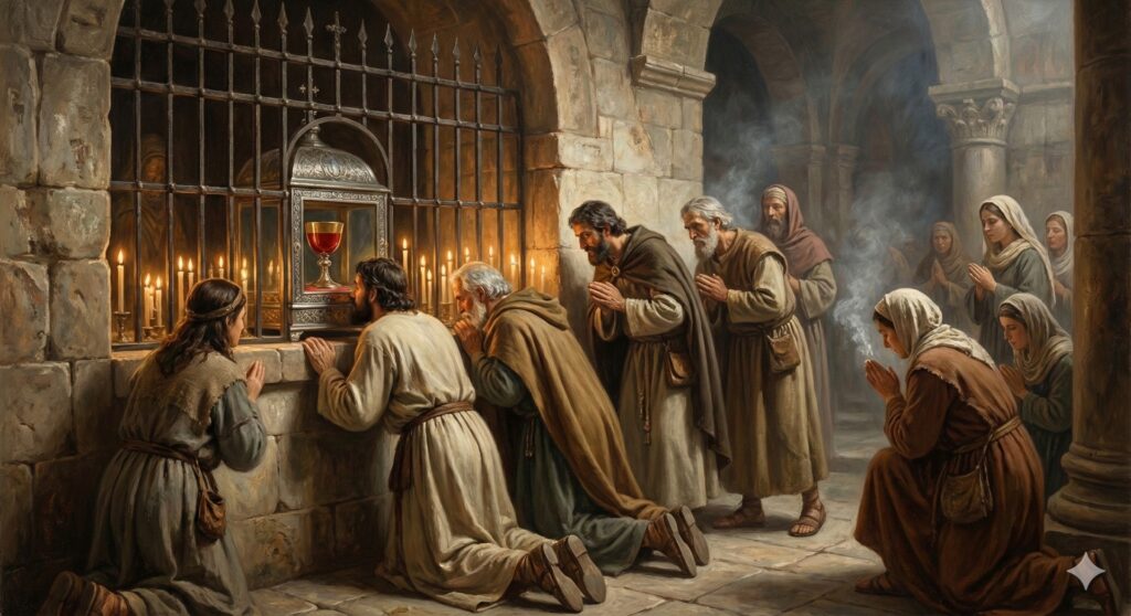 Siglos después, el cáliz se expone en Jerusalén ante los peregrinos. Según el Obispo Arculfo (año 720) y el Venerable Beda, la copa se protegía con una red y se podía tocar y besar a través de una apertura en la iglesia del Santo Sepulcro.