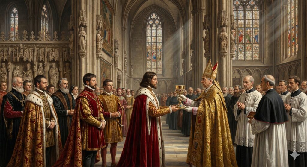 El evento fundacional donde Jesús utiliza este cáliz específico durante la Última Cena con los Apóstoles para consagrar el vino, convirtiéndolo en su Sangre. El documento detalla que la copa superior es de cornalina (piedra roja).