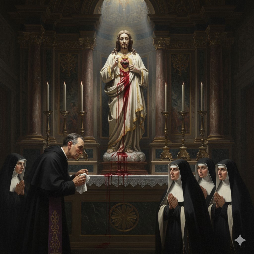 El prodigio que tuvo lugar en la Abadía de Santa María de Rosano, Italia, a partir de 1948, se centró en una estatua del Sagrado Corazón de Jesús de tamaño natural, donada ese mismo año en cumplimiento de un voto de la Segunda Guerra Mundial.