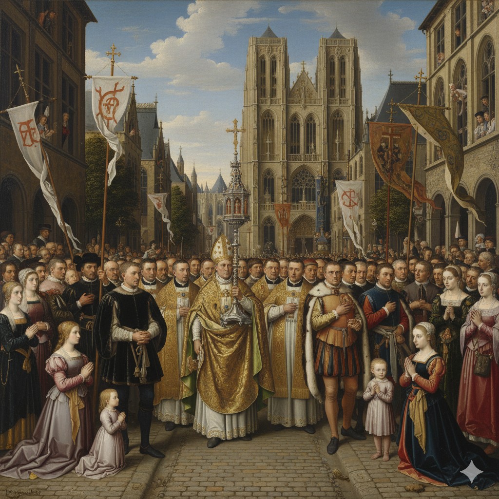 Poco tiempo después, las Santas Partículas fueron trasladadas en una solemne procesión pública a la Catedral de Santa Gúdula.