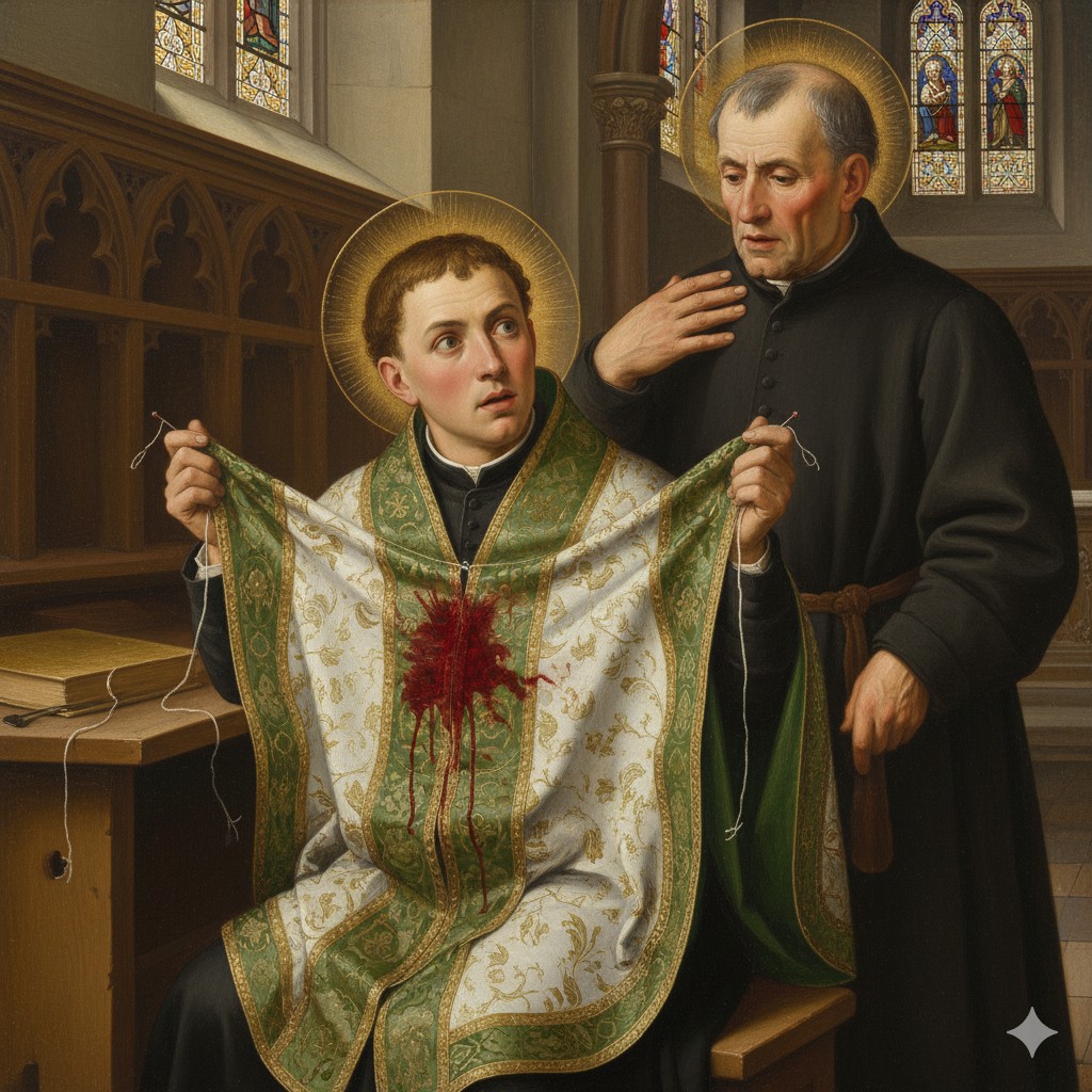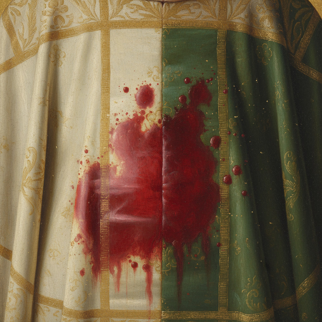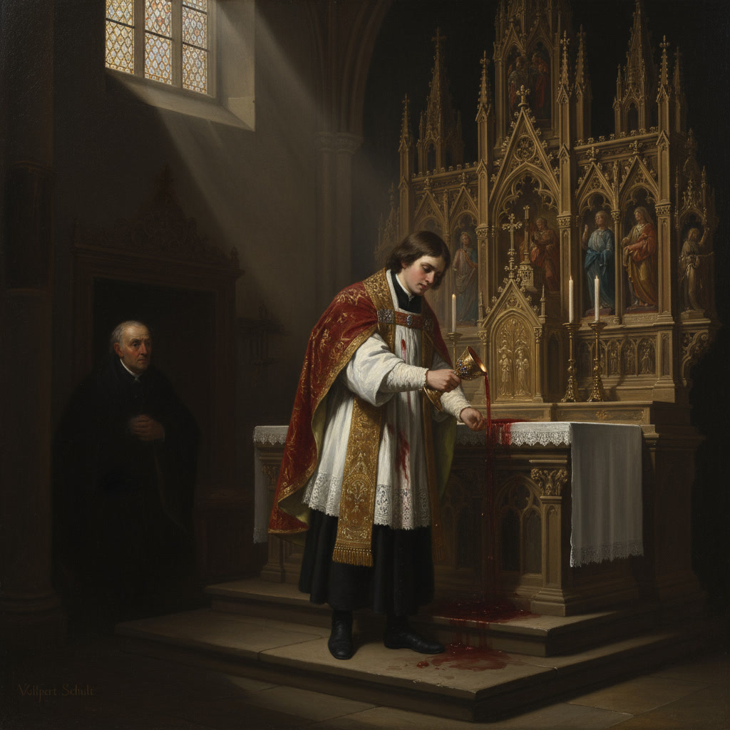 El vino blanco derramado sobre la casulla de Folkert se transforma milagrosamente en Sangre verdadera, tiñendo la tela.