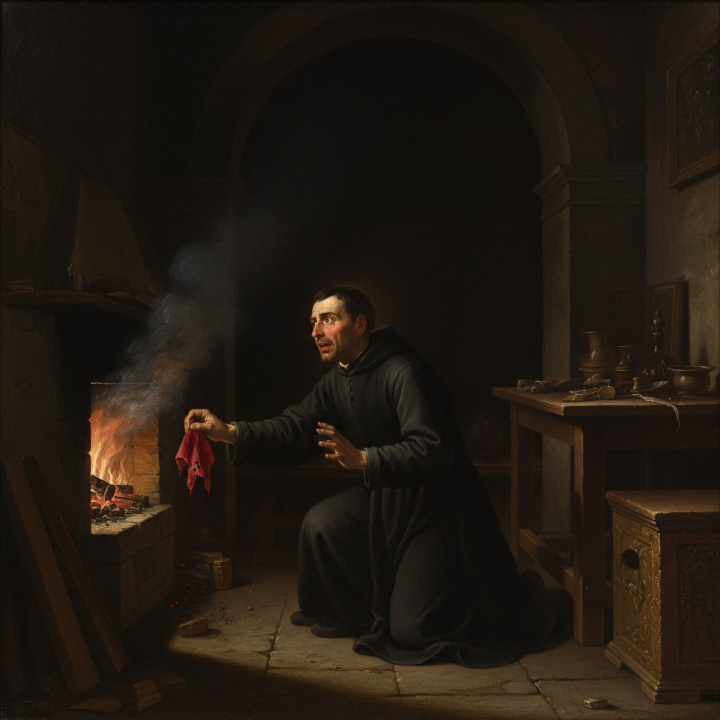 Lleno de temor, el sacerdote intentó eliminar la evidencia del suceso: cortó la parte manchada de la vestidura y la quemó. Luego remendó el corte, pero en el instante mismo en que terminaba de hacerlo, la casulla se manchó de Sangre nuevamente.