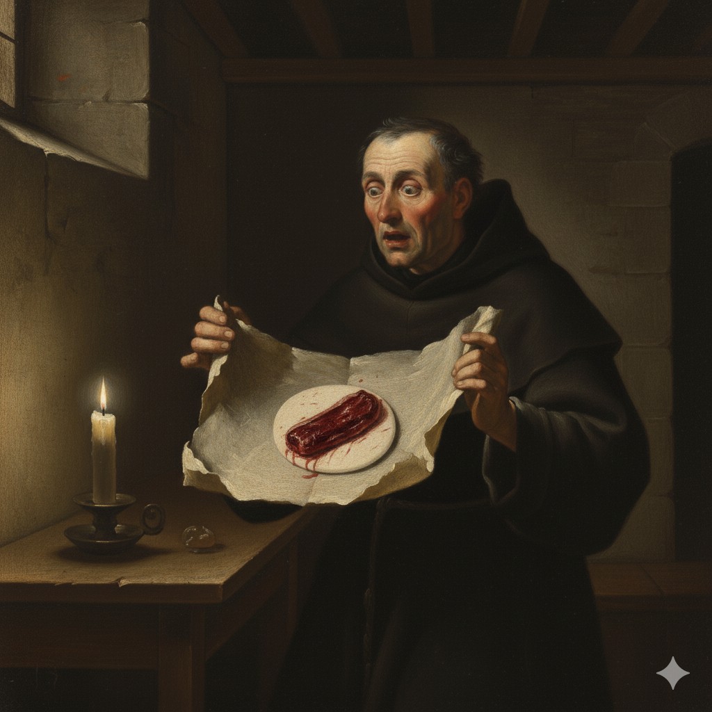 El Padre Berthold recibe el envoltorio de cera donde la mujer había guardado la Hostia. Al abrirlo, ve que la Hostia se ha transformado en carne sangrante, “dividida en dos partes, unidas entre sí por unos hilos delgados de carne sangrante”.