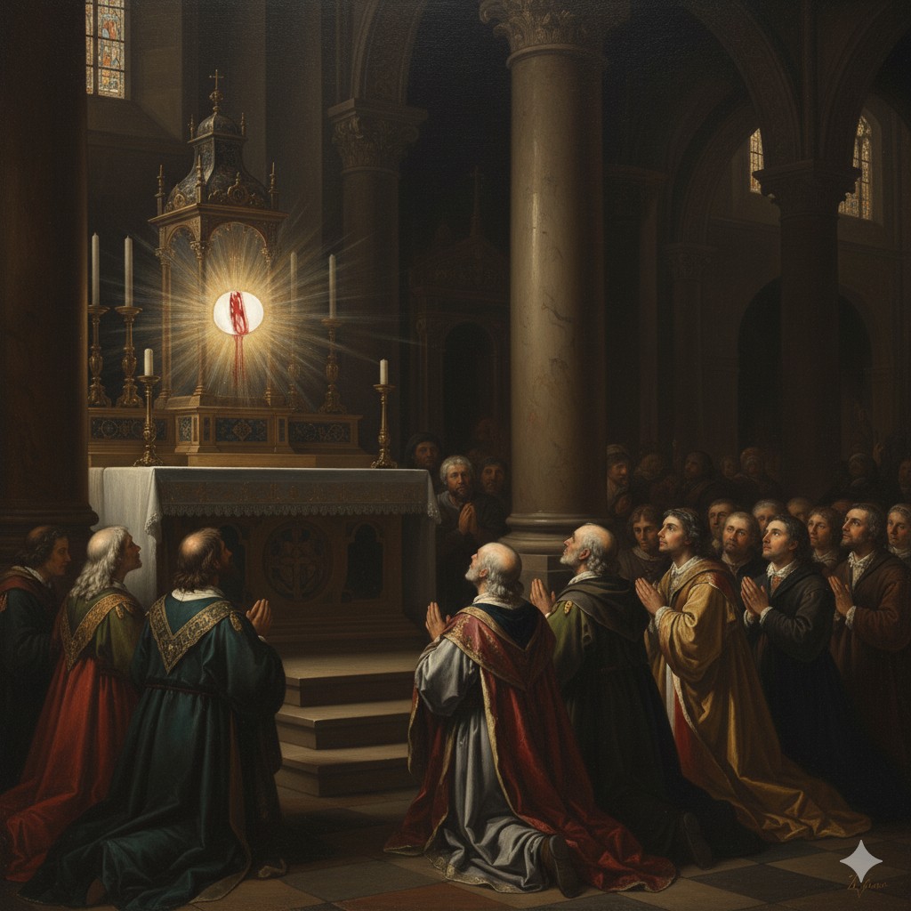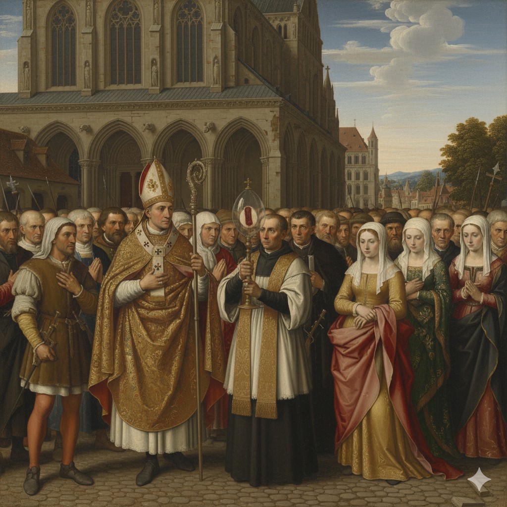 El sacerdote informa inmediatamente al obispo de la ciudad, Udalskalk. El obispo ordena que la Hostia milagrosa sea trasladada en procesión a la catedral, acompañada por el clero y el pueblo, y expuesta en una custodia de cristal para la adoración pública.