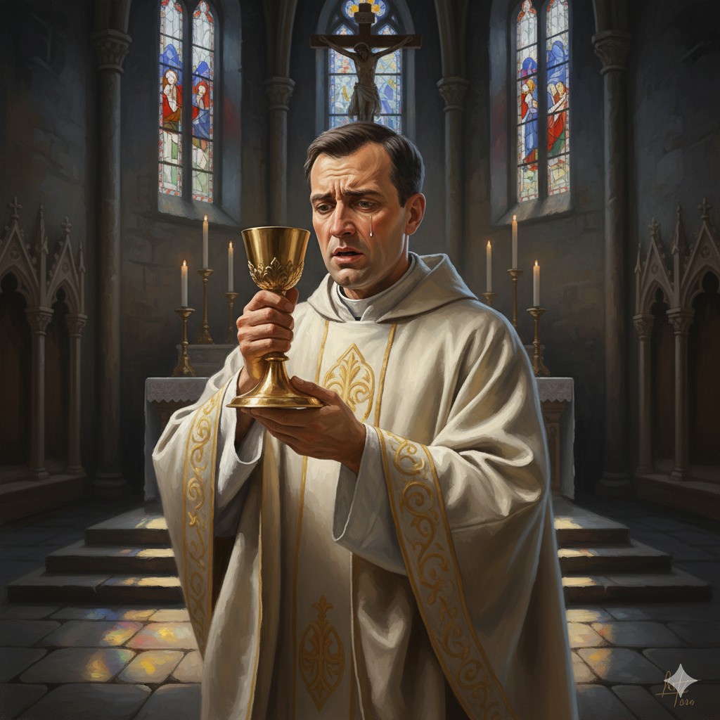 El conflicto interno del sacerdote: La escena se centra en el sacerdote en el altar, justo en el instante de la consagración. Su rostro refleja una profunda crisis de fe y duda espiritual, momentos antes de que ocurra el milagro.