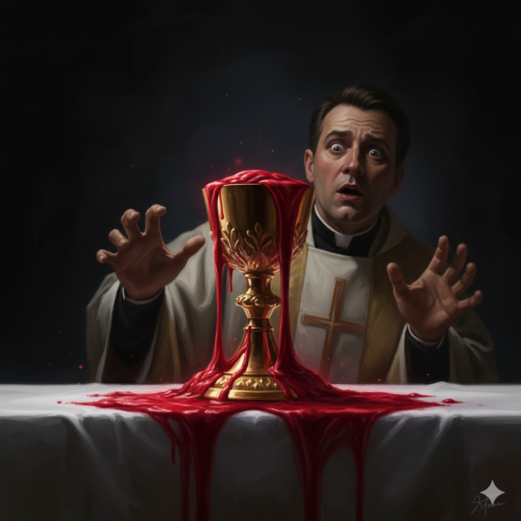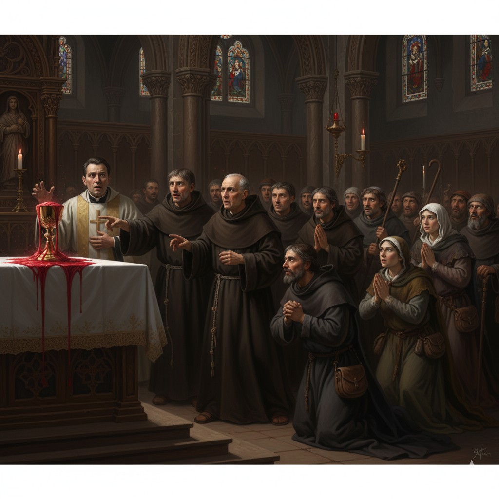 El Prodigio en el Cáliz: El vino en el cáliz se transforma en sangre real que hierve intensamente. La sangre sube hasta derramarse por los bordes, manchando el mantel blanco del altar ante la mirada atónita y temerosa del sacerdote.