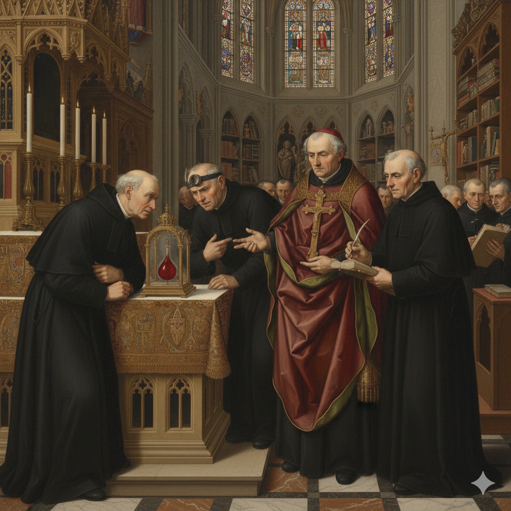 La confirmación eclesiástica: Años después, una comisión de clérigos de alto rango analiza la reliquia de la sangre. La escena muestra el acto formal de investigación y verificación para declarar oficialmente la autenticidad del milagro.