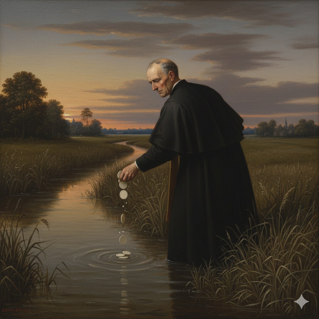 Siendo escéptico ante la verdad de la transubstanciación, el párroco toma consigo las Partículas consagradas sobrantes después de la Misa y las arroja en uno de los canales o al agua del río.