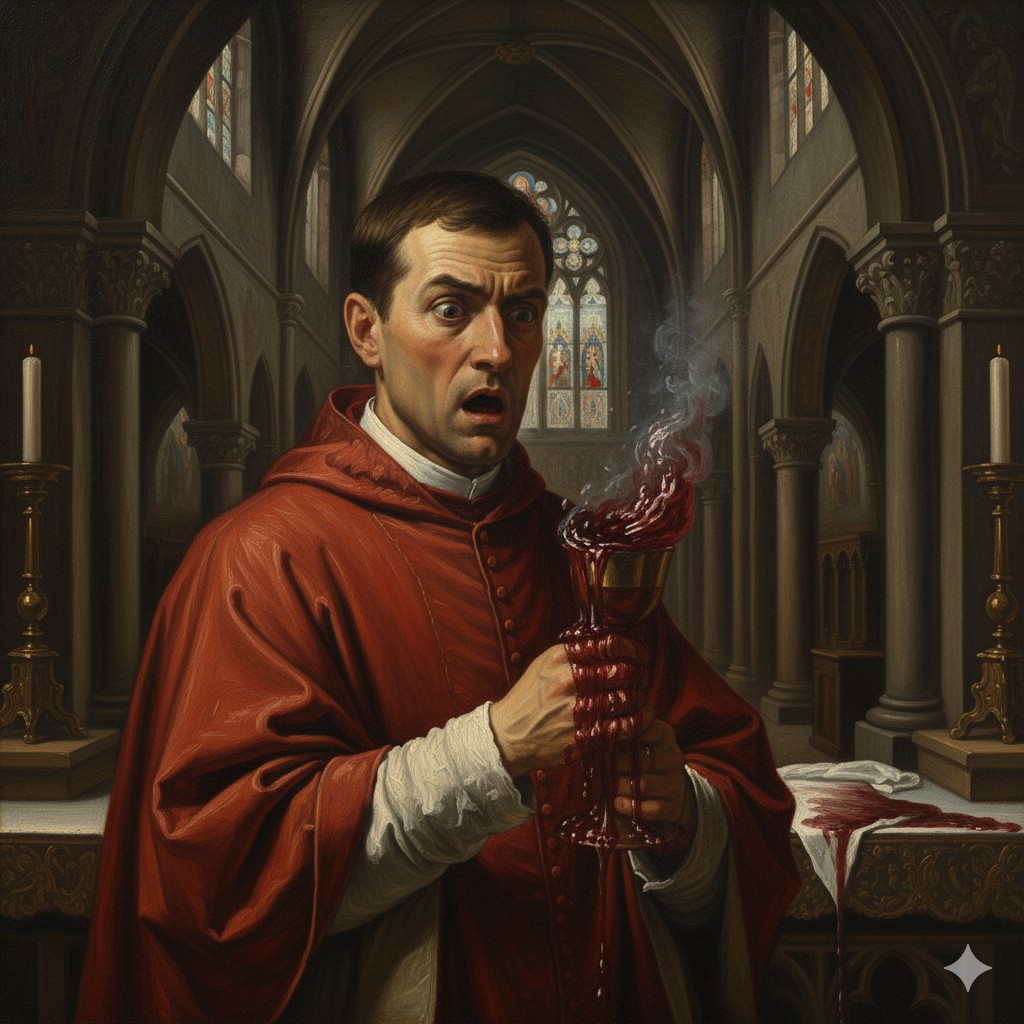 De manera dramática, y como respuesta a su escepticismo, las especies del vino consagradas comenzaron a hervir vigorosamente, hasta desbordarse del cáliz. El vino se transformó milagrosamente en Sangre, la cual se derramó sobre el corporal (la tela litúrgica). La Sangre, al caer, se coaguló hasta formar una masa sólida.