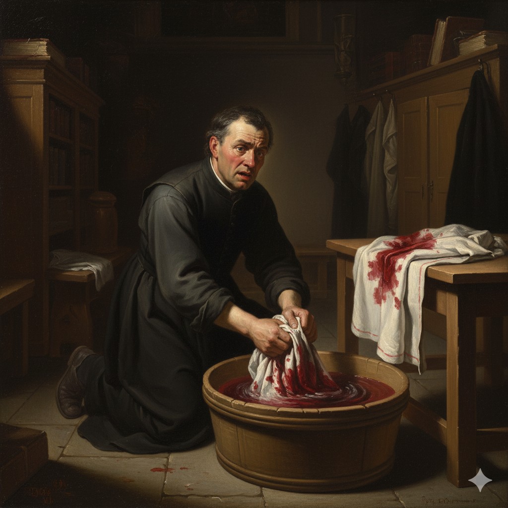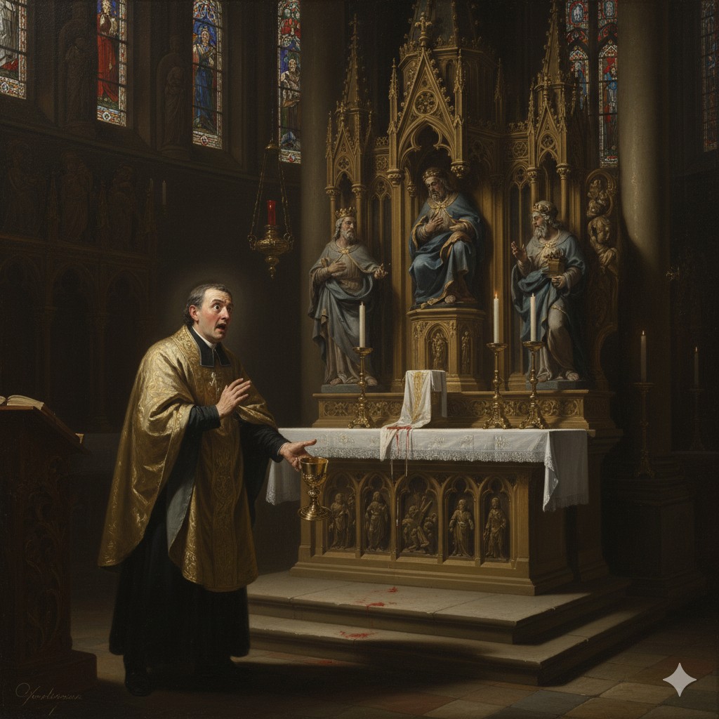 Atormentado por el temor y la confusión, el sacerdote intentó infructuosamente lavar las manchas. Al no poder eliminar la Sangre, ocultó las reliquias bajo su cama y mantuvo el secreto durante años.