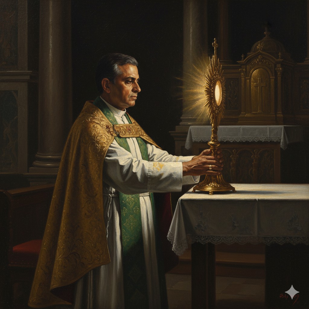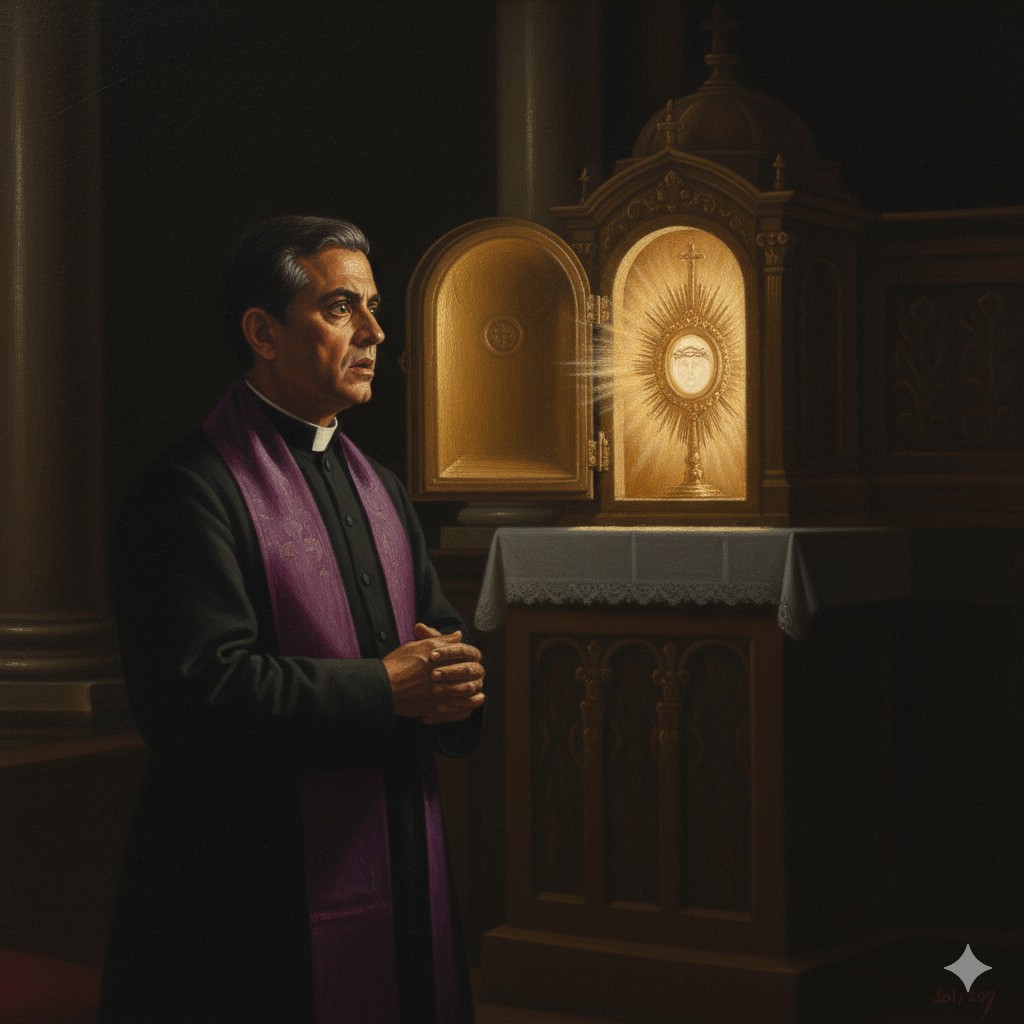 Creyendo que podría estar imaginándolo, el sacerdote le pregunta al monaguillo qué ve en la custodia. El monaguillo responde que ve “la figura de un hombre”. A medida que el sacerdote y los fieles comienzan la adoración, la figura del rostro humano se vuelve progresivamente más nítida.