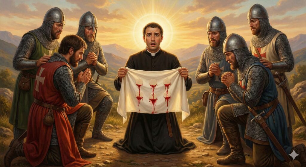 Tras repeler el primer ataque, el Padre Mateo regresa al lugar del escondite para recuperar las hostias y dar la comunión a los capitanes. Al desenterrar y desplegar el corporal, descubre con asombro que las seis hostias están completamente bañadas en sangre fresca, pegadas al paño.