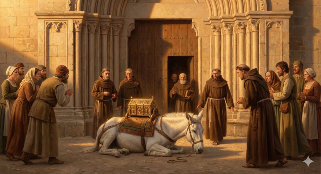 Después de 12 días de viaje y recorrer unas 200 millas, la mula llega exhausta a la ciudad de Daroca y se detiene (o desploma, según la tradición) justo frente a la iglesia de San Marcos (hoy convento de la Trinidad/Iglesia de Santa María), eligiendo así el hogar final del milagro.