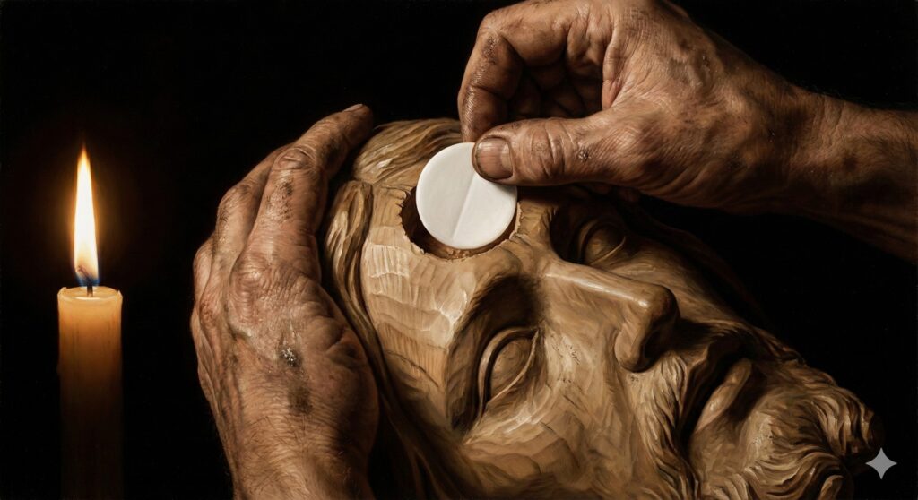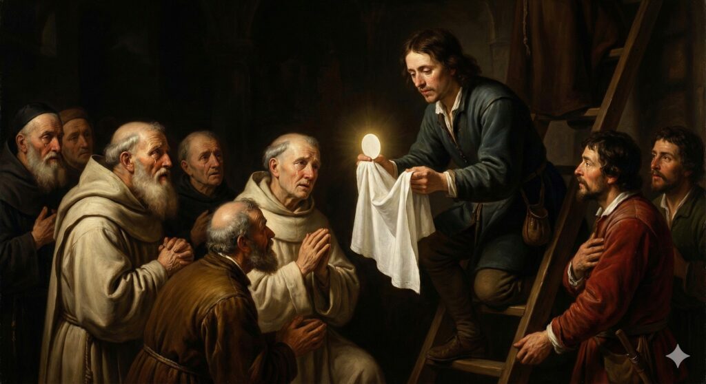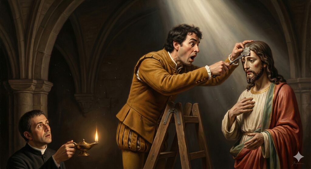El artista, en un acto de devoción secreta, cava un orificio de 6 centímetros de diámetro en la frente de la estatua de Jesús para depositar allí la Eucaristía, ocultándola dentro de la escultura.