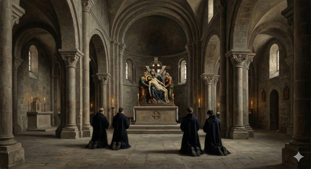 Desde 1251, la partícula sagrada permanece oculta y olvidada. El grupo escultórico del Descendimiento preside el monasterio, venerado por su belleza, pero sin que nadie sospeche el tesoro que guarda en su interior durante casi dos siglos.