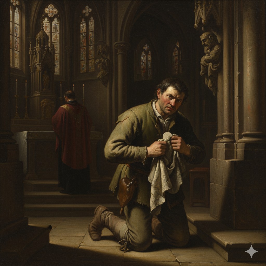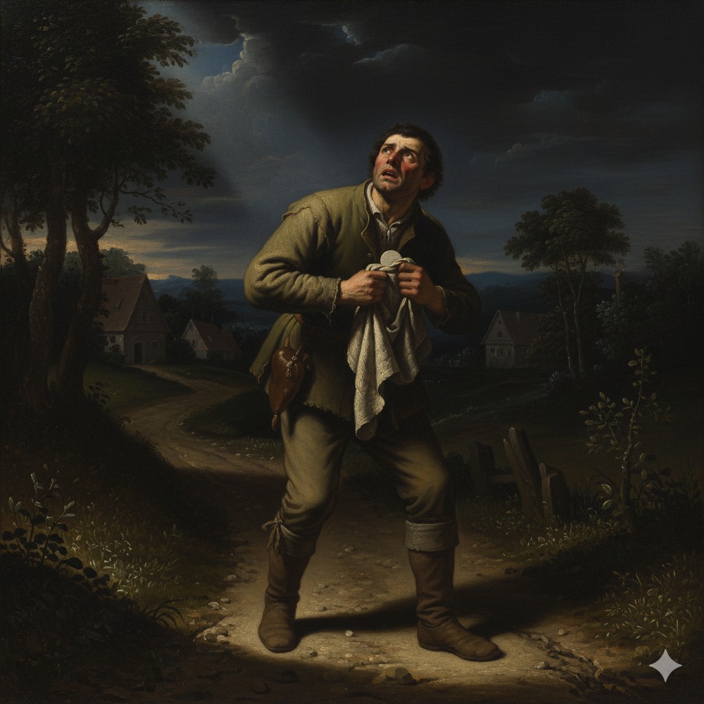 Durante el camino de regreso a su casa, el campesino comenzó a sentir un fuerte remordimiento. Convencido de que debía restituir la Partícula sagrada, intentó regresar.