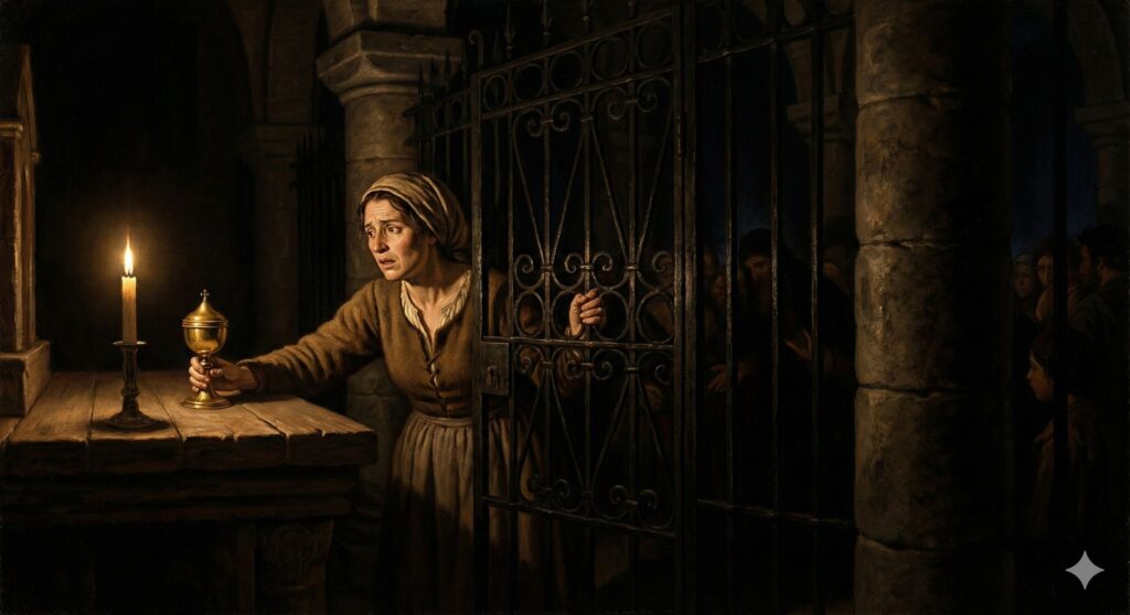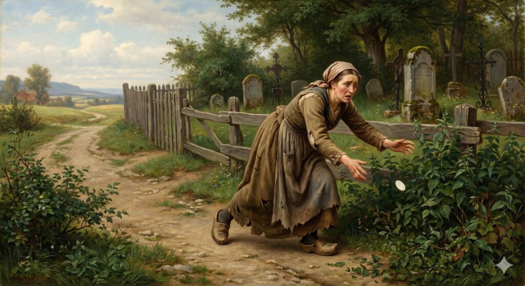 Huyendo con la Hostia robada, Anna pasa el cementerio, pero de repente el Santísimo Sacramento se vuelve insoportablemente pesado. Incapaz de avanzar o retroceder debido al peso sobrenatural, arroja la Hostia en un matorral de ortigas cerca de una empalizada.