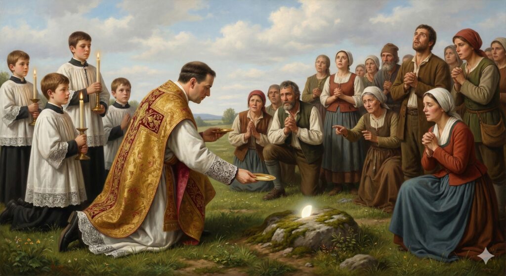 El párroco llega procesionalmente para recuperar la Hostia. Logra recoger los seis pedazos que formaban los pétalos, pero cuando intenta tomar la partícula central, esta se entierra sola en el suelo ante los ojos de todos, desapareciendo en la tierra. Este sitio se convierte en el lugar del altar del futuro santuario.