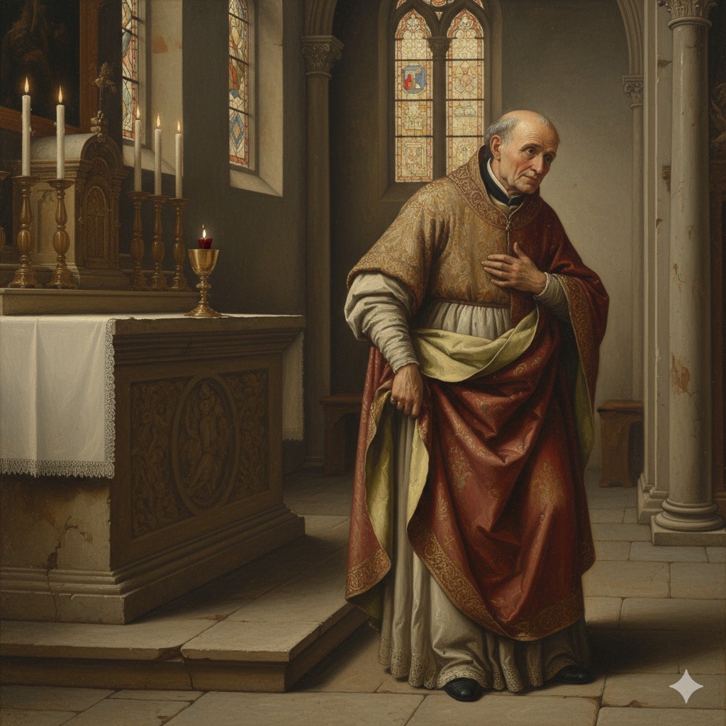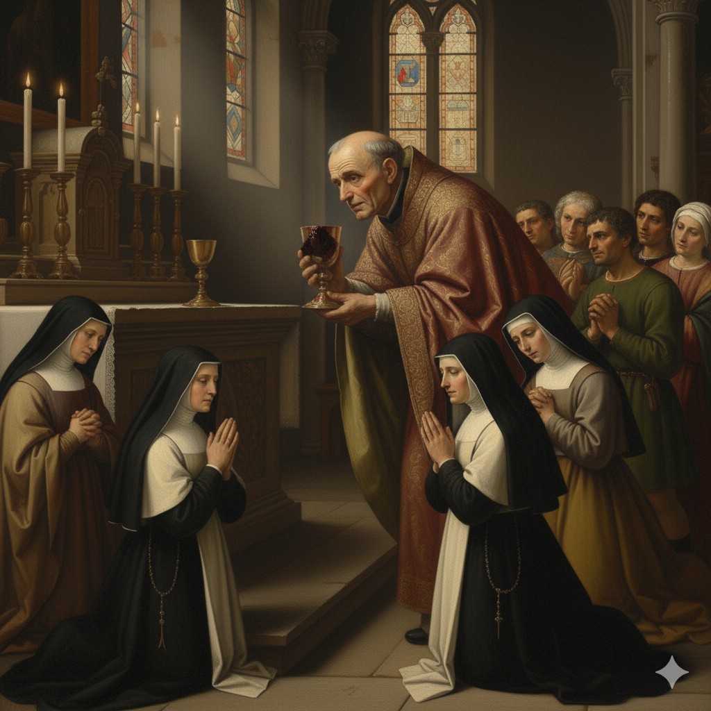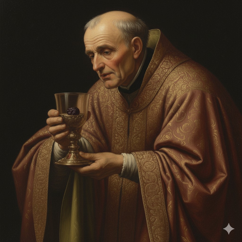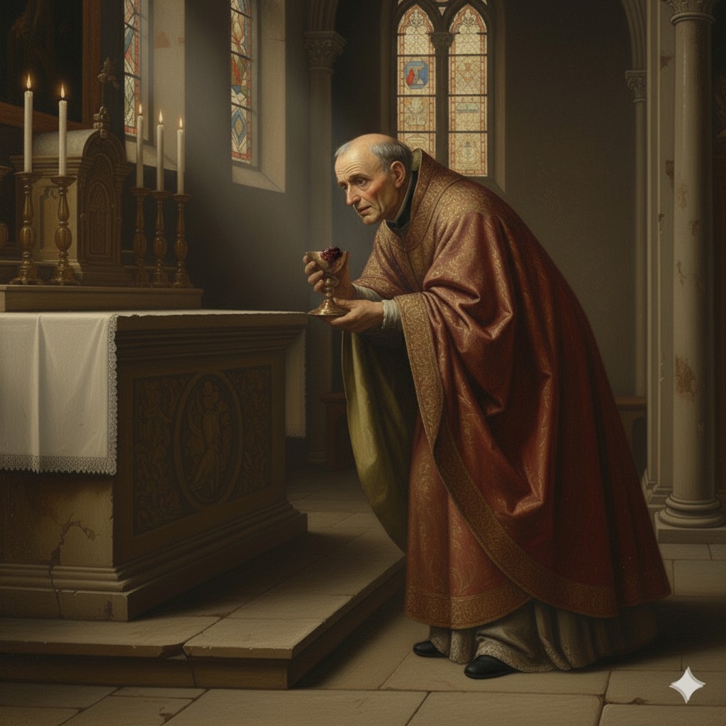Al día siguiente, el sacerdote regresa a la iglesia para celebrar la Misa y, al tomar el mismo cáliz, encuentra en su interior sangre viva coagulada y convertida en carne, en lugar del vino que había dejado.