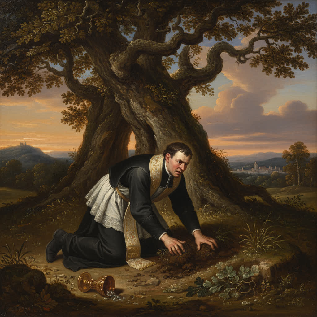 Lleno de remordimiento, el pastor confiesa su acto a su párroco. El sacerdote va inmediatamente al lugar indicado para intentar recuperar la Partícula sagrada, pero a pesar de buscarla, no puede encontrarla.