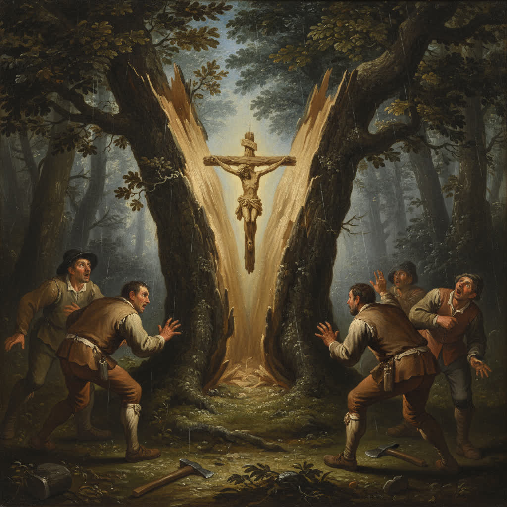 En el preciso momento en que el árbol es cortado y se parte en dos, un crucifijo perfectamente tallado y formado cae al suelo desde el interior de la madera.
