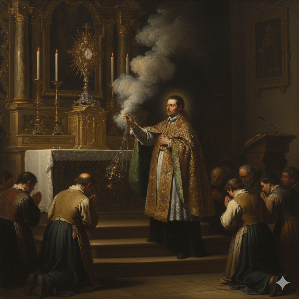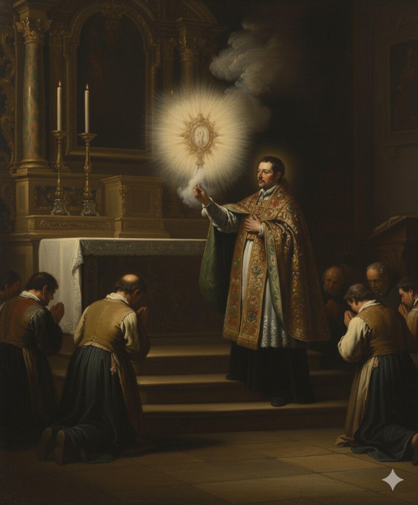 El párroco Nicolás Nezan, estaba incensando la custodia y cantando el himno Pange lingua. En el momento de la estrofa “Verbum caro Panem verum”, la Hostia desapareció y en su lugar apareció la figura de un hombre. Esta figura tenía un rostro luminoso, cabello castaño hasta los hombros, manos cruzadas sobre el pecho y vestía una túnica blanca.
