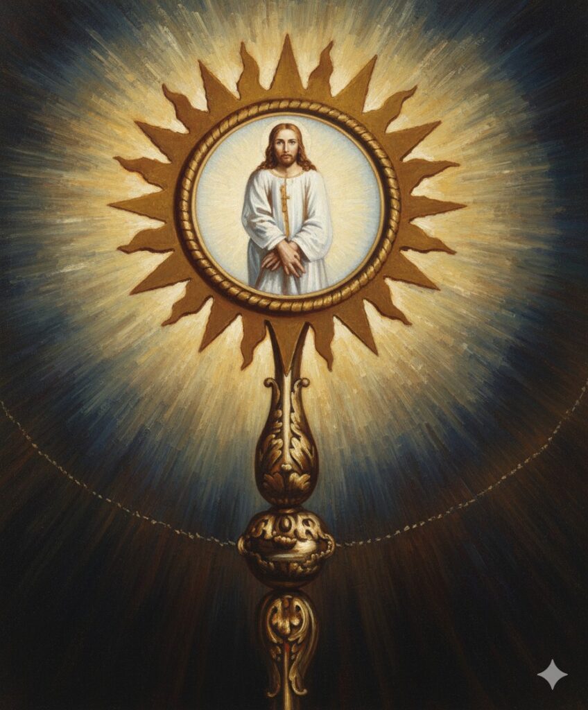 Mientras el párroco cantaba el himno Pange lingua, específicamente durante la estrofa “Verbum caro Panem verum”, la Hostia desapareció y fue reemplazada por la figura de un hombre. Esta figura tenía el rostro luminoso, cabello castaño hasta los hombros, manos cruzadas sobre el pecho y una túnica blanca.