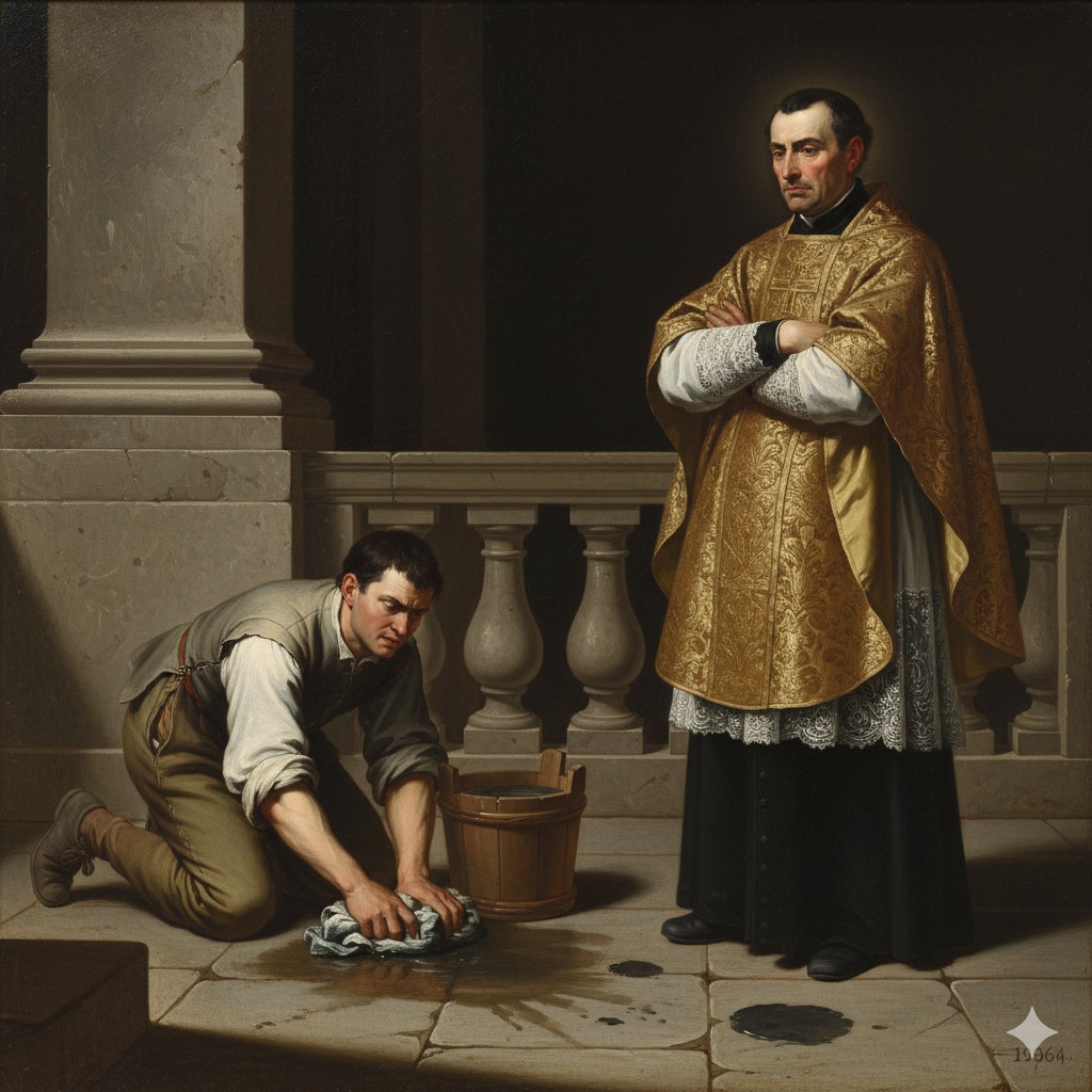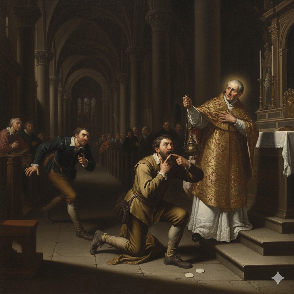 En la iglesia de San Bernardino, durante la Misa del lunes de Pascua de 1604, el párroco Don Salvador Spiga comienza a distribuir la Comunión. Dos hombres, conocidos en el pueblo por llevar una vida disoluta y estar en pecado mortal, se acercan al altar para comulgar.