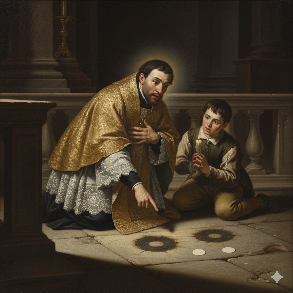 Los hombres justificaron su acción sacrílega explicando que las Hostias les “hervían como carbones encendidos” y les habían quemado la lengua. Sintiendo remordimiento por no haberse confesado, huyeron de la iglesia. El párroco, al ir a recoger las Partículas, descubrió que estas habían dejado huellas perfectamente circulares impresas en la piedra, “como esculpidas”. A pesar de que ordenó lavar la piedra cuidadosamente, todo intento de borrar las marcas resultó inútil. Estas huellas milagrosas se conservan hasta el día de hoy en la Parroquia de San Bernardino.