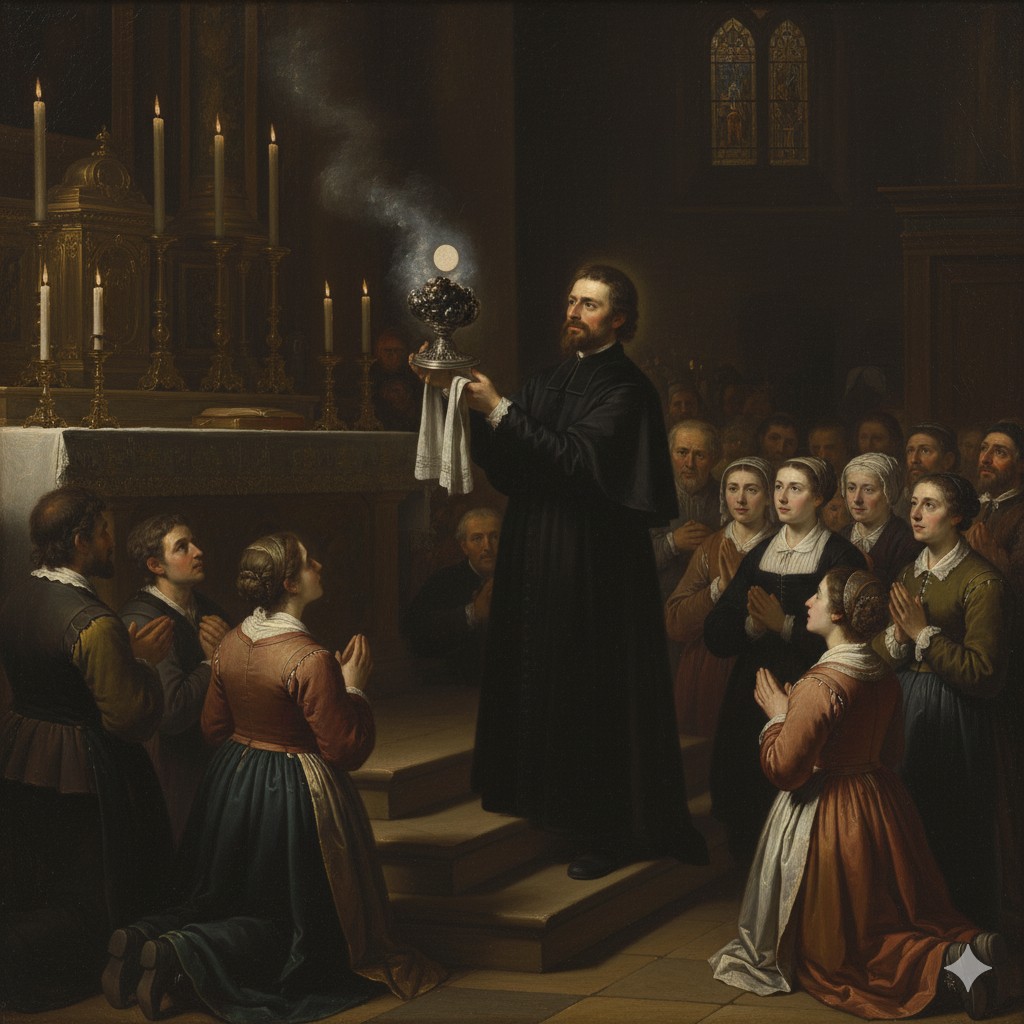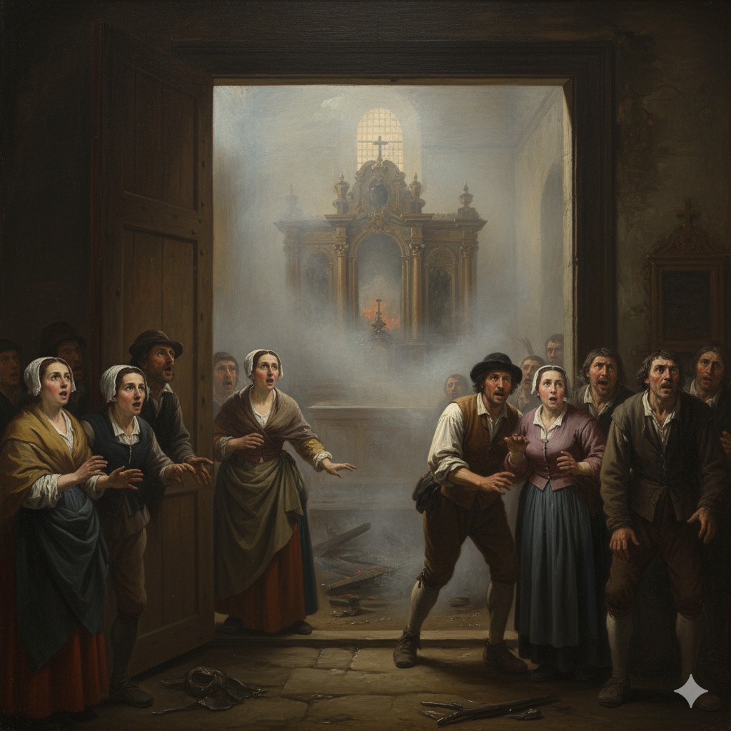El Jueves Santo de 1643, después de la Misa, el sacerdote guardó el cáliz con una Hostia consagrada en el tabernáculo. El sacristán cerró la iglesia a mediodía. Dos horas después, los vecinos vieron un humo negro y espeso; dos cirios dejados al pie del tabernáculo, avivados por el aire de unas ventanas abiertas, habían iniciado un incendio.