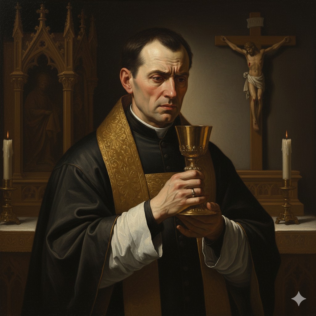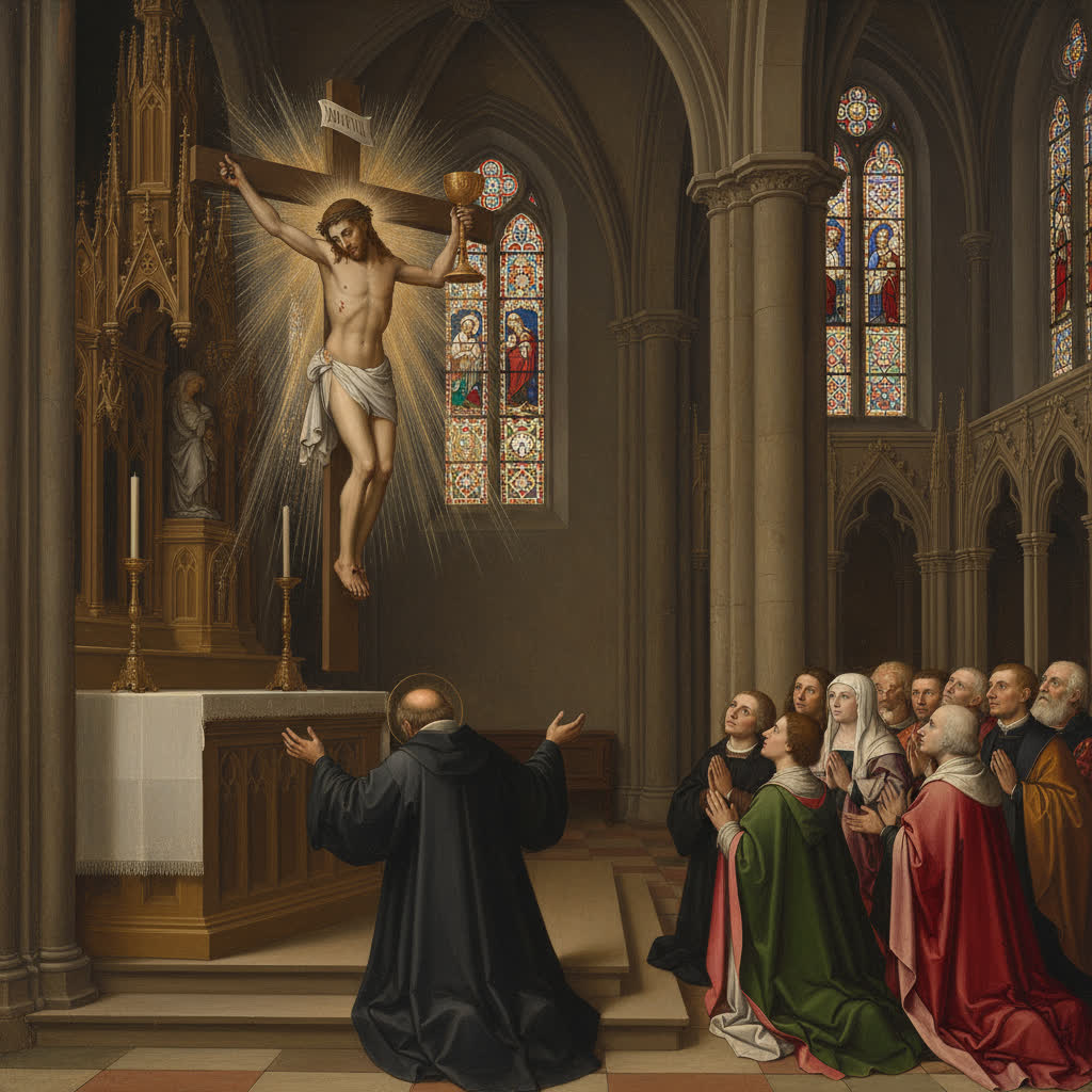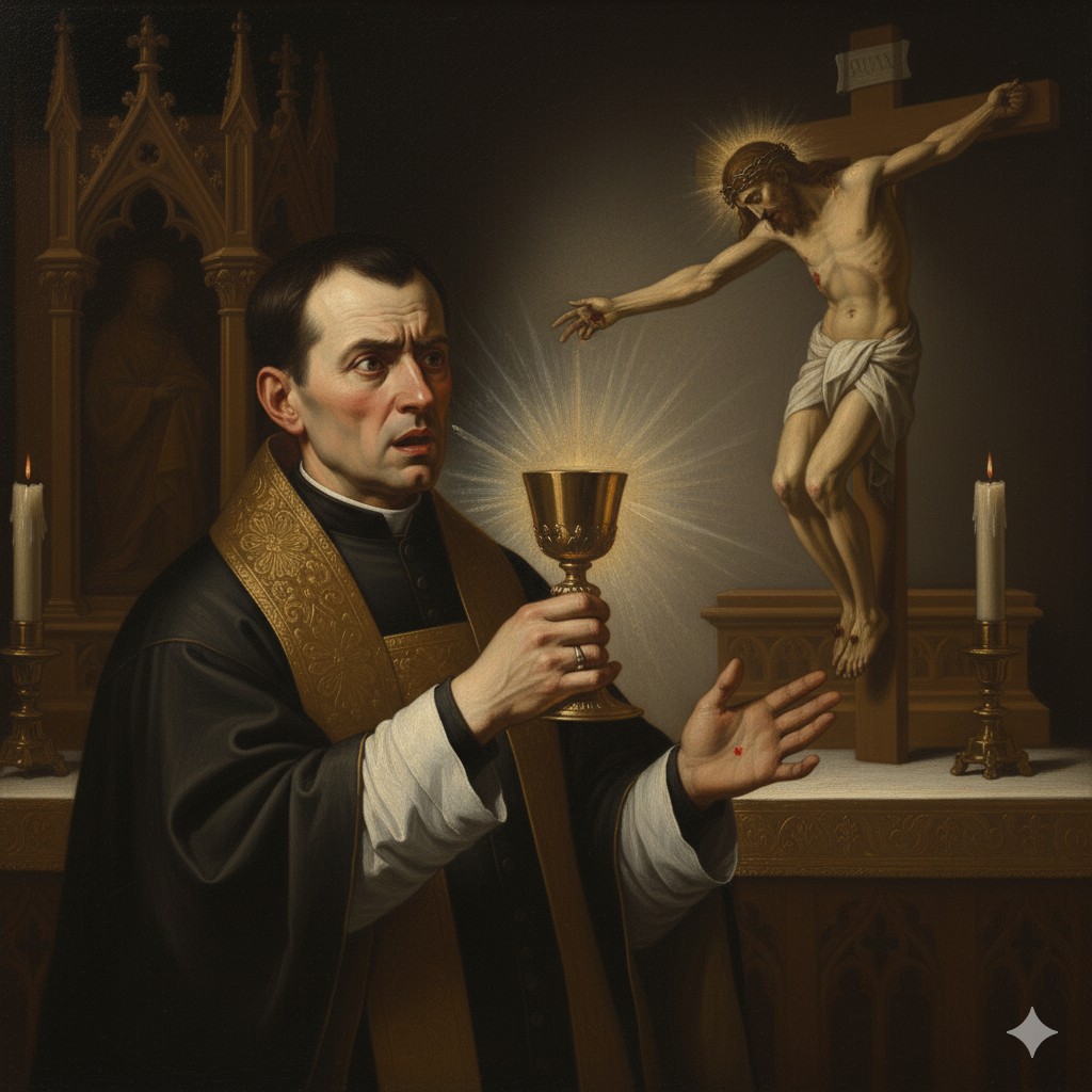 Mientras el sacerdote dudoso luchaba por elevar el cáliz, el crucifijo de madera situado encima del altar cobró vida. La figura de Cristo extendió lentamente un brazo, se inclinó y tomó el cáliz directamente de las manos del sacerdote.