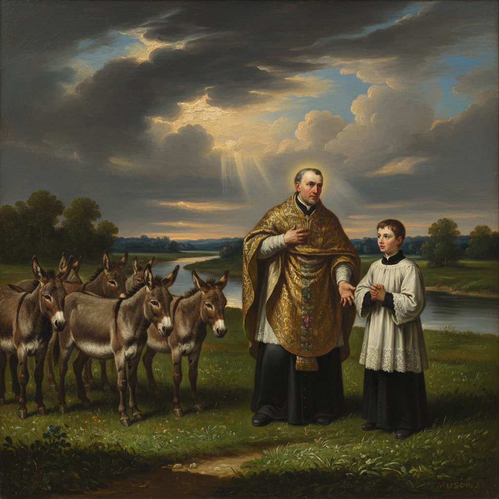 Al llegar a los prados cerca del río Muson (también conocido como Cime) , el sacerdote y el monaguillo fueron interceptados por varios asnos que estaban pastando en el campo.