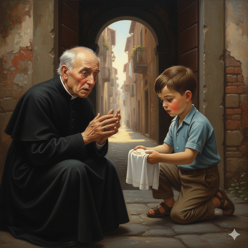 El niño recogió las Hostias y, dándose cuenta de lo que eran, las entregó inmediatamente al párroco de la iglesia.