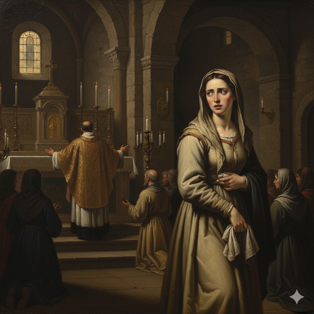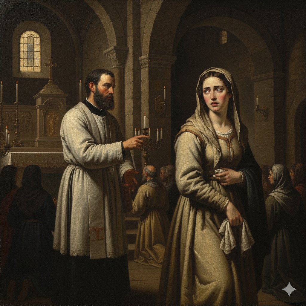 Un sacerdote se da cuenta de la acción de la mujer, la sigue inmediatamente fuera del altar y le ordena, en nombre de la Iglesia, que muestre el contenido robado del pañuelo.