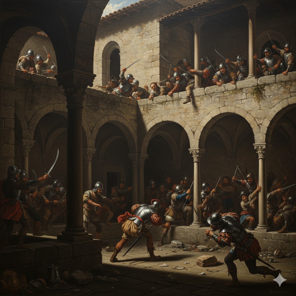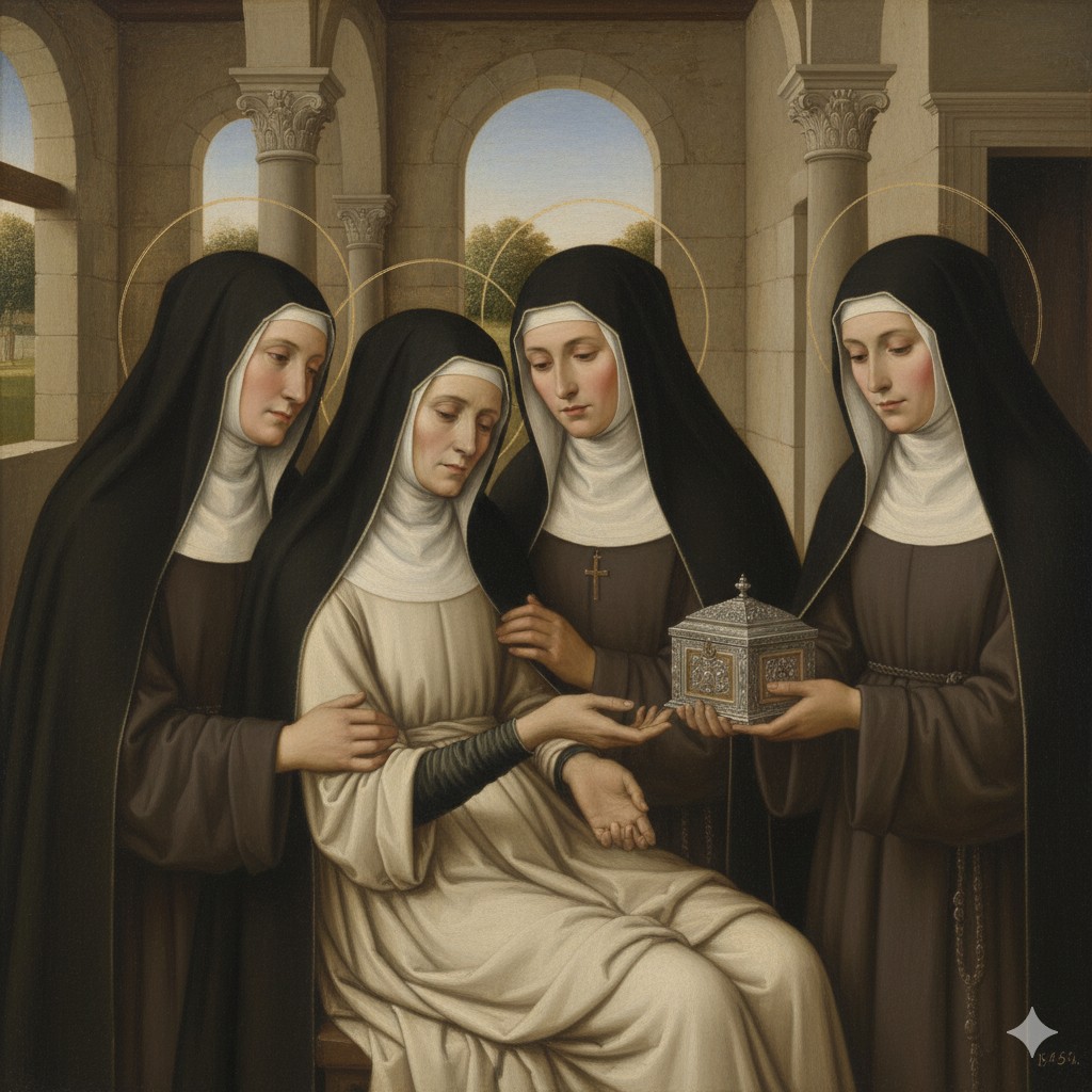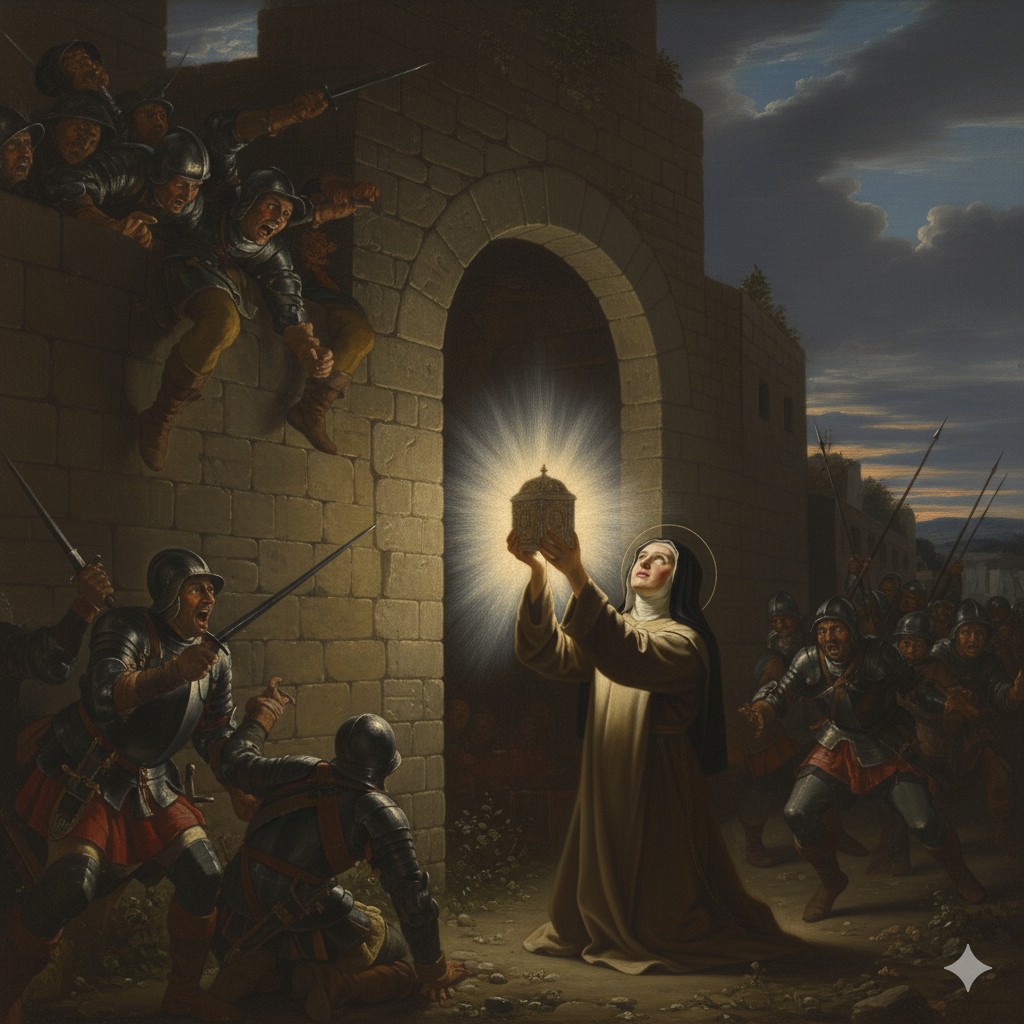 Mientras las monjas estaban sobrecogidas por el terror, Santa Clara, a pesar de estar enferma, actuó con un corazón impávido. Ordenó que la llevaran a la puerta para enfrentar a los enemigos, precedida por una cajita de plata y marfil que contenía la Eucaristía, el “Cuerpo del Santo de santos”. Postrada en oración, Clara cuestionó al Señor sobre si entregaría a sus siervas indefensas. Inmediatamente, una voz como de niño resonó desde el tabernáculo (la cajita), prometiéndole: “¡Yo te custodiaré siempre!”. Tras esta divina seguridad, la audacia de los soldados se transformó en temor, y abandonaron con rapidez los muros que habían escalado, huyendo dispersados por la fuerza de la oración de Clara.