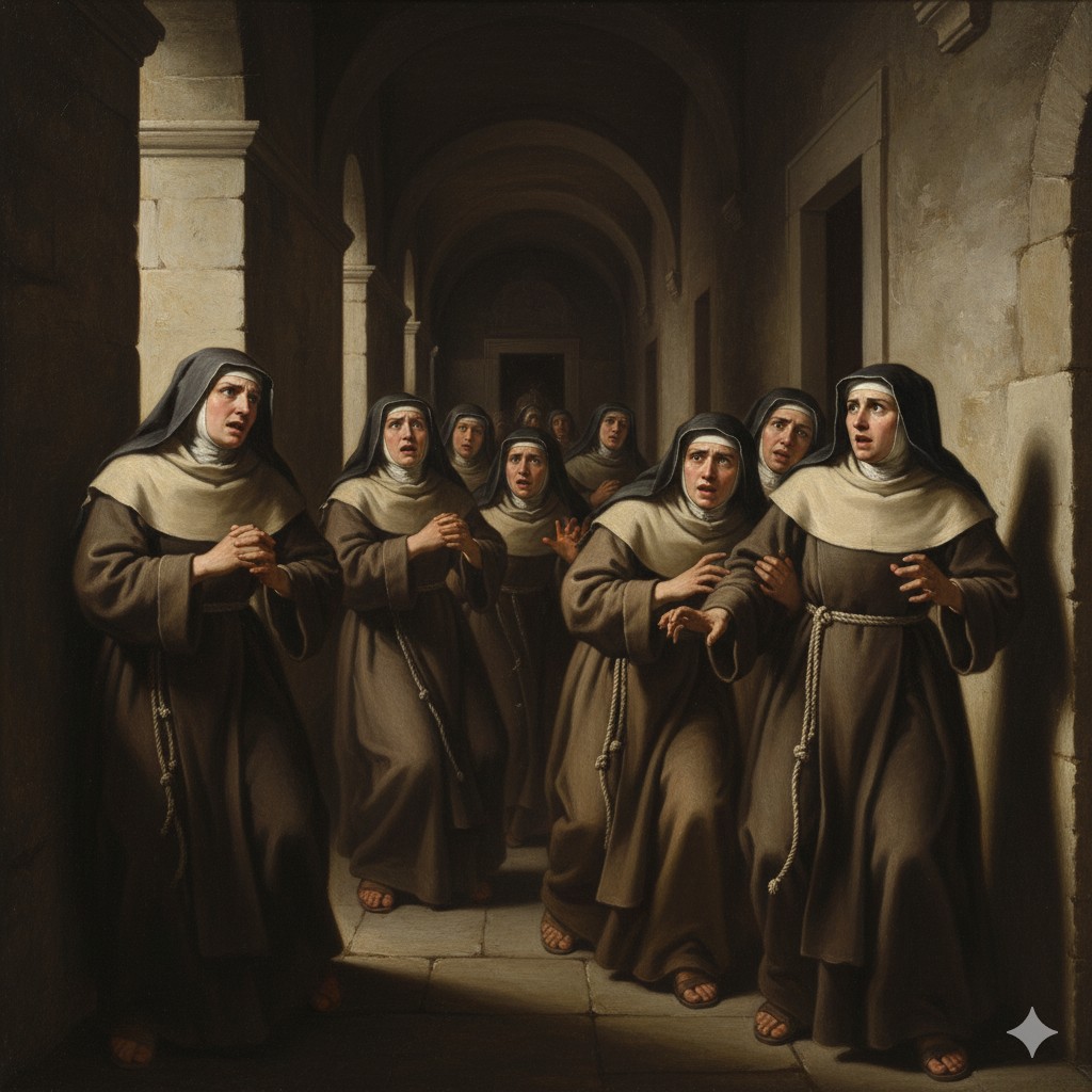Los corazones de las monjas (vírgenes) se llenan de terror ante la invasión. Sus voces tiemblan de miedo y corren llorando a buscar a su madre, Santa Clara.
