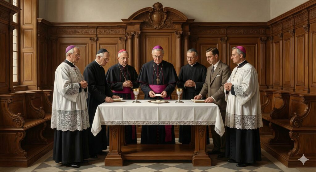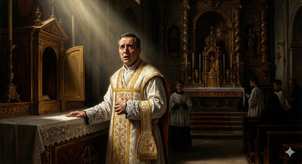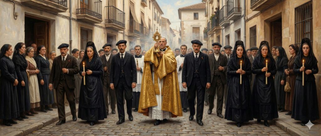 El párroco organiza una procesión solemne para devolver las Hostias recuperadas a la iglesia, un acto de reparación y alegría para el pueblo.