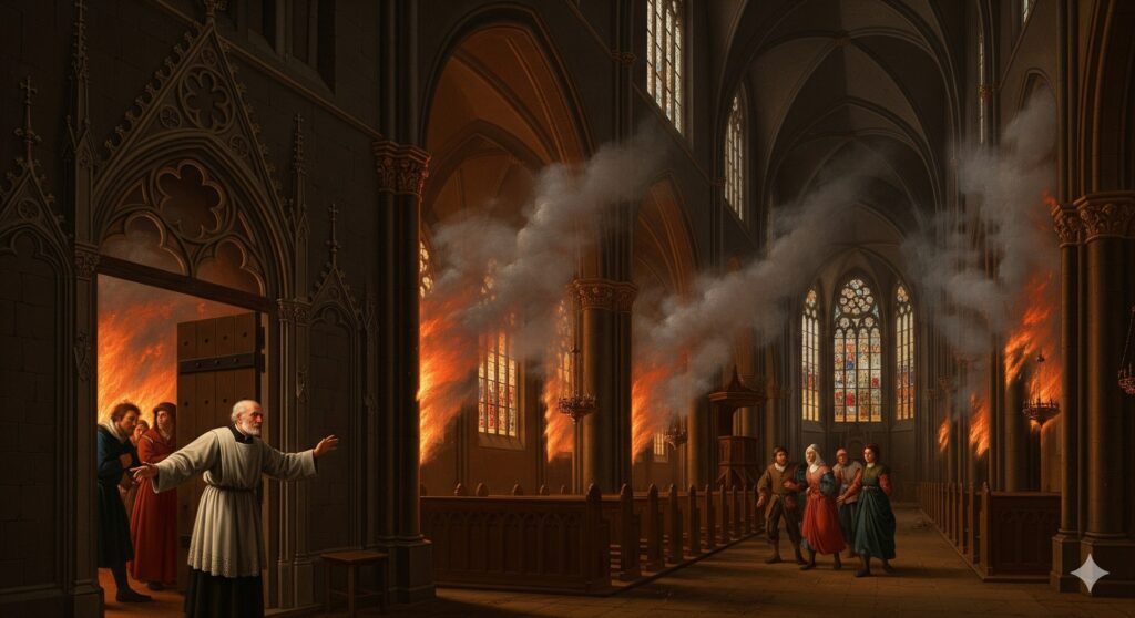 Mientras las llamas se propagaban rápidamente por el interior de la iglesia, el anciano párroco, Jan Hocaerts, pidió ayuda a los vecinos.