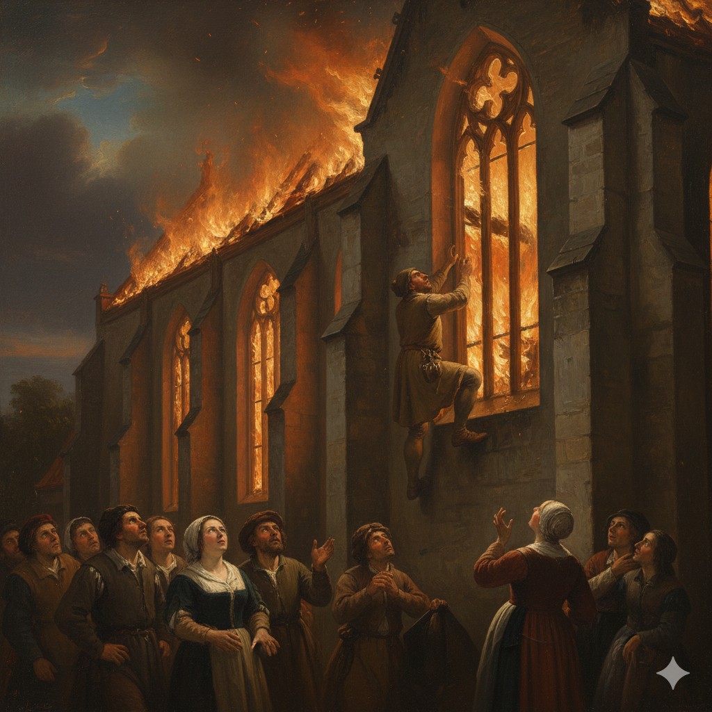 En el pueblo de Stiphout, Holanda, se desató una violenta tempestad. Un rayo impactó la parroquia, atravesándola y prendiéndole fuego por completo.
