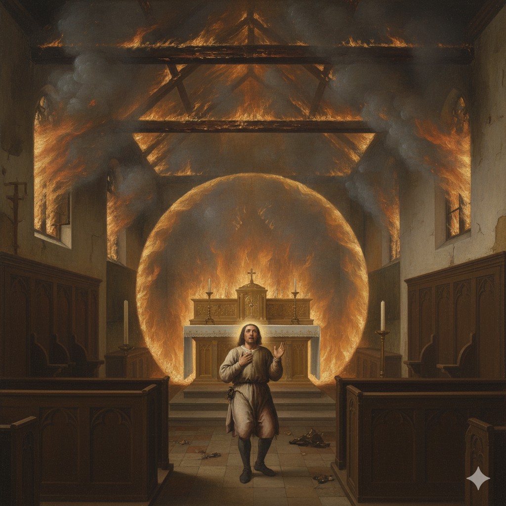 Jan Baloys rompió el seguro de la ventana, entró y se maravilló al ver que, aunque las llamas habían devastado toda la iglesia, no se acercaban a la zona donde estaba el tabernáculo.