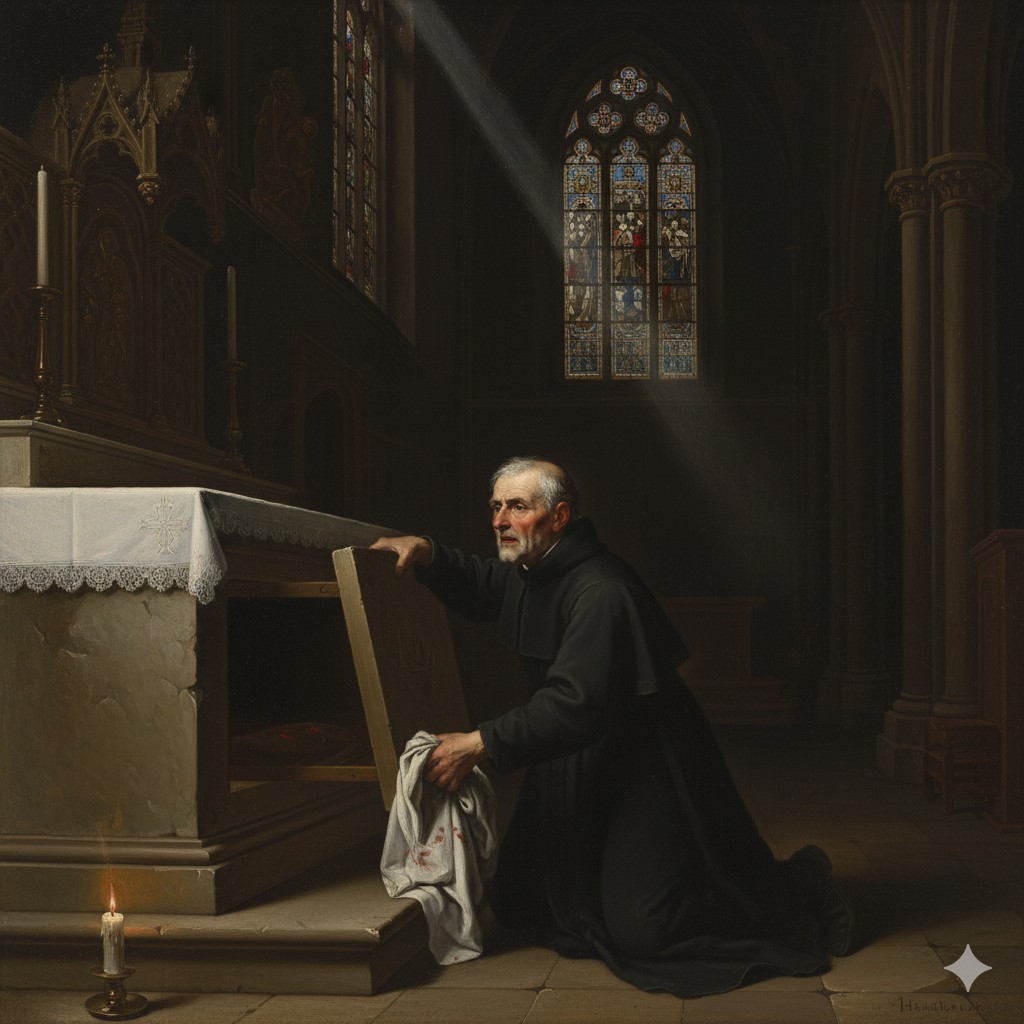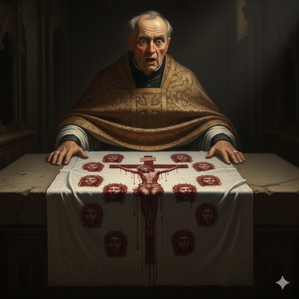 El sacerdote no tuvo el valor de revelar el milagro en ese momento y escondió el corporal bajo el altar. Muchos años después, cuando estaba agonizante, confesó lo sucedido y reveló dónde se encontraba la reliquia.