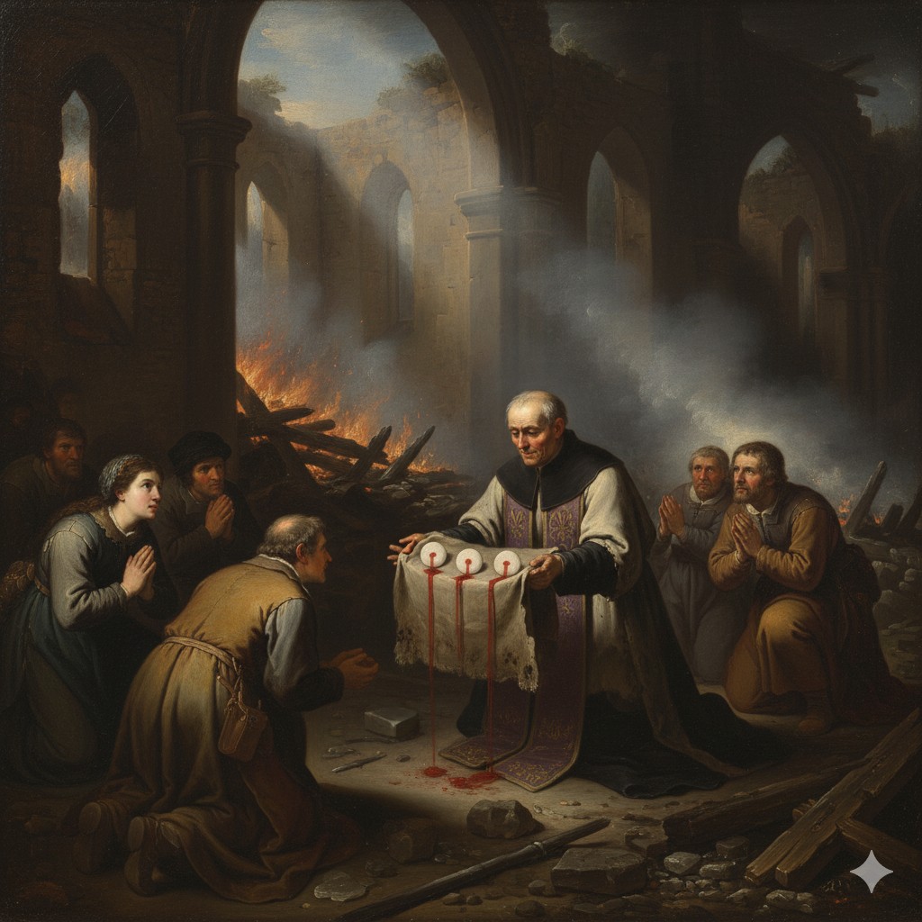 Después del incendio, mientras se revisaban los restos carbonizados de la iglesia parroquial, se encontraron tres Hostias consagradas que estaban completamente intactas y de las cuales brotaba sangre.