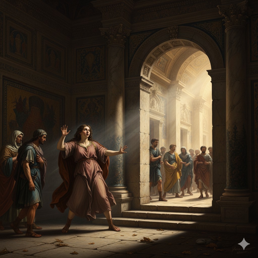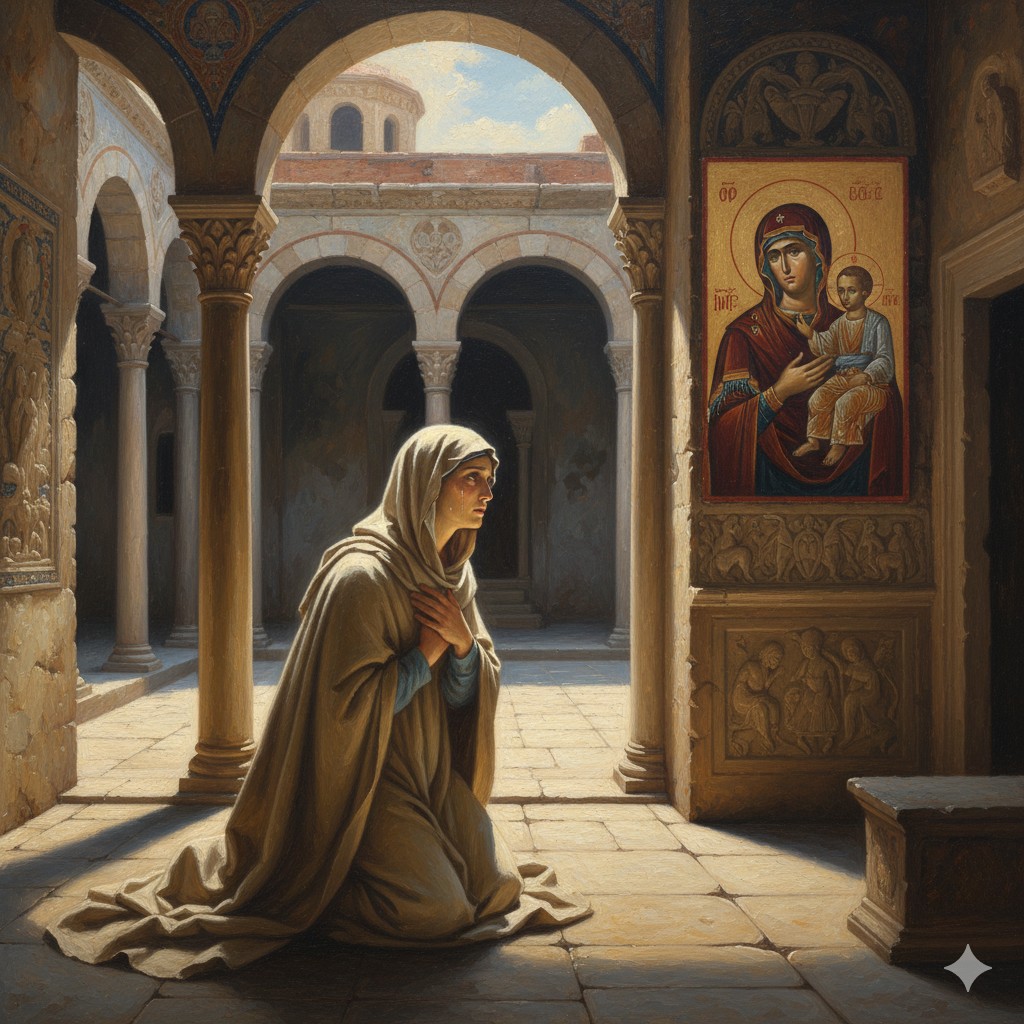 Llena de temor por no poder entrar, María alza los ojos y ve una imagen de la Santa Virgen. En ese instante, siente un profundo arrepentimiento por su vida pecaminosa. Solo después de este arrepentimiento, puede entrar al templo.