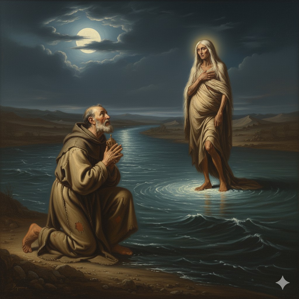 Un día, se encontró con el monje Zósimo y le pidió que regresara al año siguiente con los Sacramentos. Cuando Zósimo volvió con la Eucaristía a la orilla del Jordán, vio a María en la orilla opuesta. El milagro ocurrió cuando ella hizo el signo de la cruz sobre el agua y caminó sobre el río “como si fuera tierra firme” para recibir la comunión.
