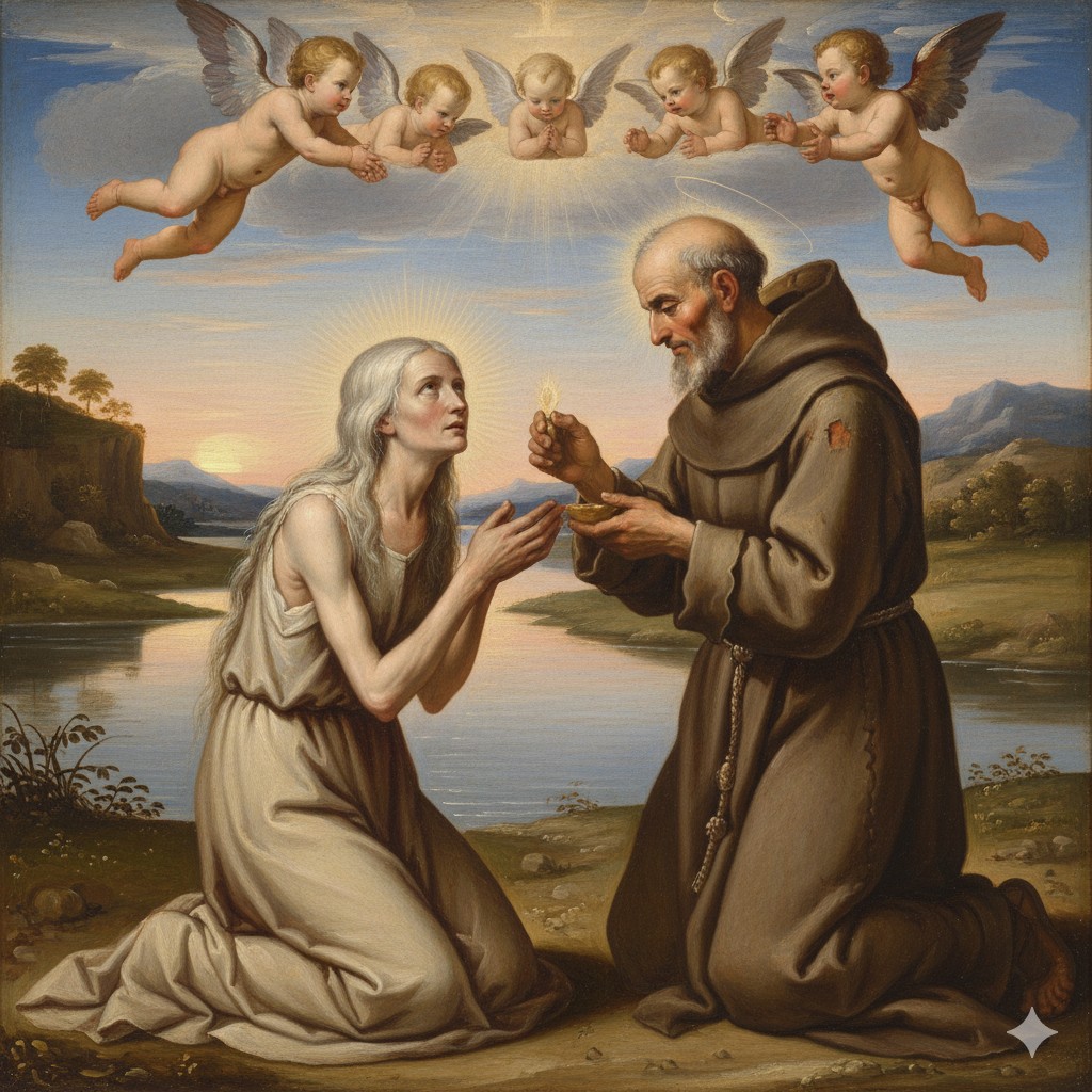 Tras cruzar milagrosamente el Jordán, María Egipcia recibe la Sagrada Eucaristía de manos del monje Zósimo. (Este evento es el clímax del “Milagro Eucarístico” , como se muestra en varias imágenes del PDF ).