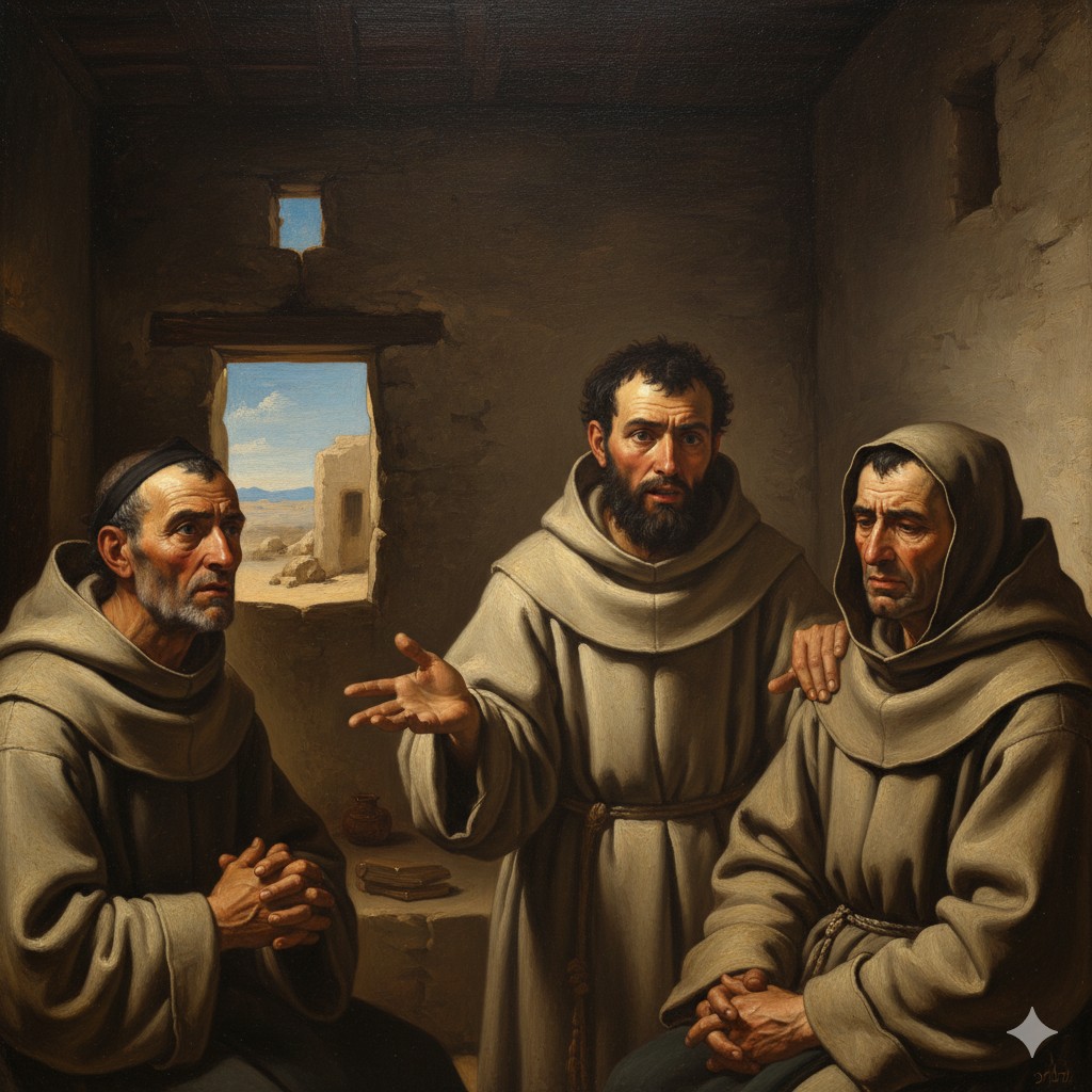 La narración se centra en un monje de Scete que, aunque era muy piadoso y laborioso, dudaba de la presencia real de Jesús en la Eucaristía, afirmando por ignorancia que el pan era solo un símbolo y no el verdadero Cuerpo de Cristo. Dos monjes ancianos oyeron esto y, sabiendo que era un buen hombre, decidieron hablar con él.