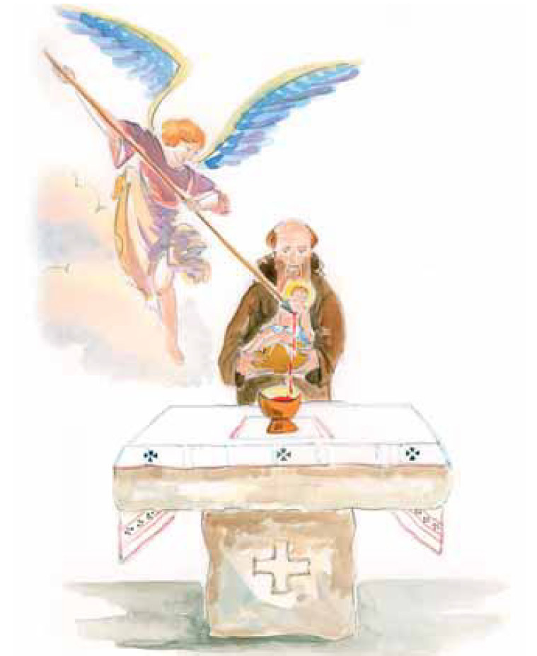 Cuando el sacerdote se dispuso a partir el pan, un ángel bajó del cielo, inmoló al niño con una espada y vertió su sangre en el cáliz. Luego, mientras el sacerdote fraccionaba el pan, el ángel también partió el cuerpo del niño en pequeños pedazos.