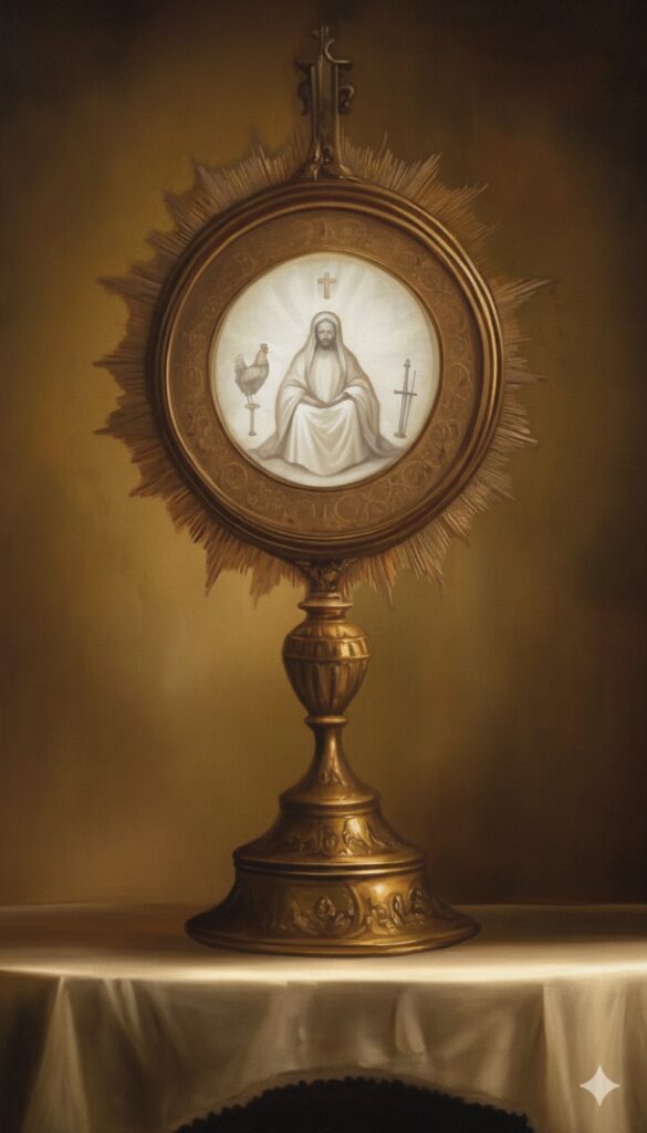 La mujer, desconociendo la doctrina de la Presencia Real , intentó sacar la Hostia de la custodia usando un cuchillo. En ese momento, la Hostia comenzó a derramar sangre viva. La sangre se secó, dejando impresa la imagen del Señor sentado en un trono semicircular con instrumentos de la Pasión a su lado.